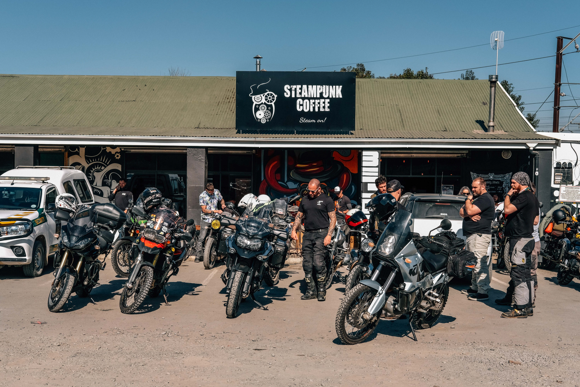 The next day, the group woke to the sounds of “Nothing Else Matters” by Metallica playing from one of our speakers—a tradition that Alan and I picked up in Peru. There was frost on some of the seats and a spectacular view of the Drakensberg escarpment off in the distance. We set out shortly after 9:00 a.m. and would be making our way to Howick to meet up with the Durban Crew at Steampunk Coffee. We had some great coffee, shook some hands, and made some small talk with new friends when we suddenly realized that we were now going to be pushed for time and had to get moving fast.