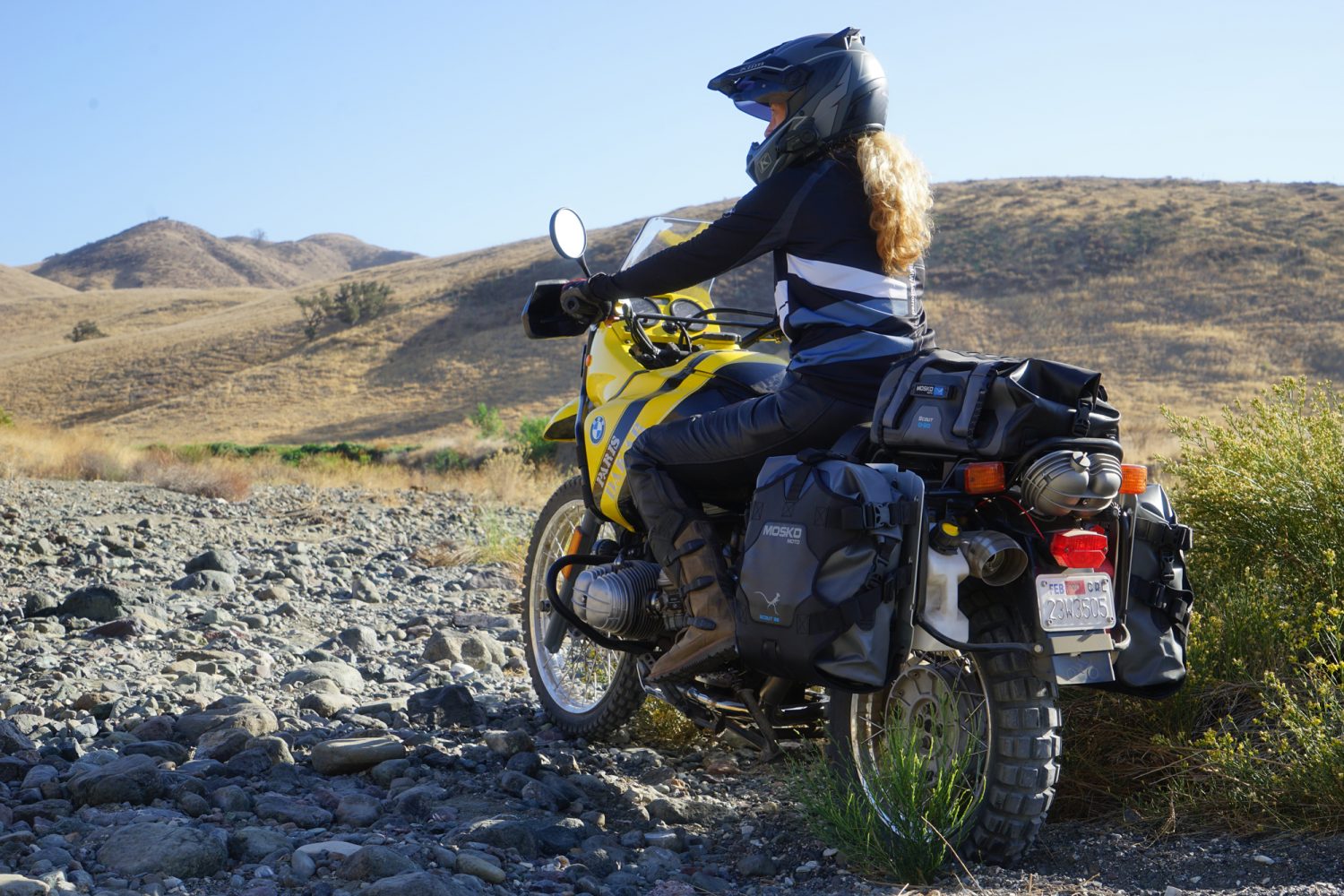 With Mosko Moto Scout 25-liter pannier bags affixed and a Scout 30-liter duffle strapped to the gear rack, Gina eyes the line out of a rock-strewn arroyo. On technical topography, even with a full 9.24-gallon tank, many find that the R 100 GS-PD handles more like a nimble enduro and less like a modern adventure bike.