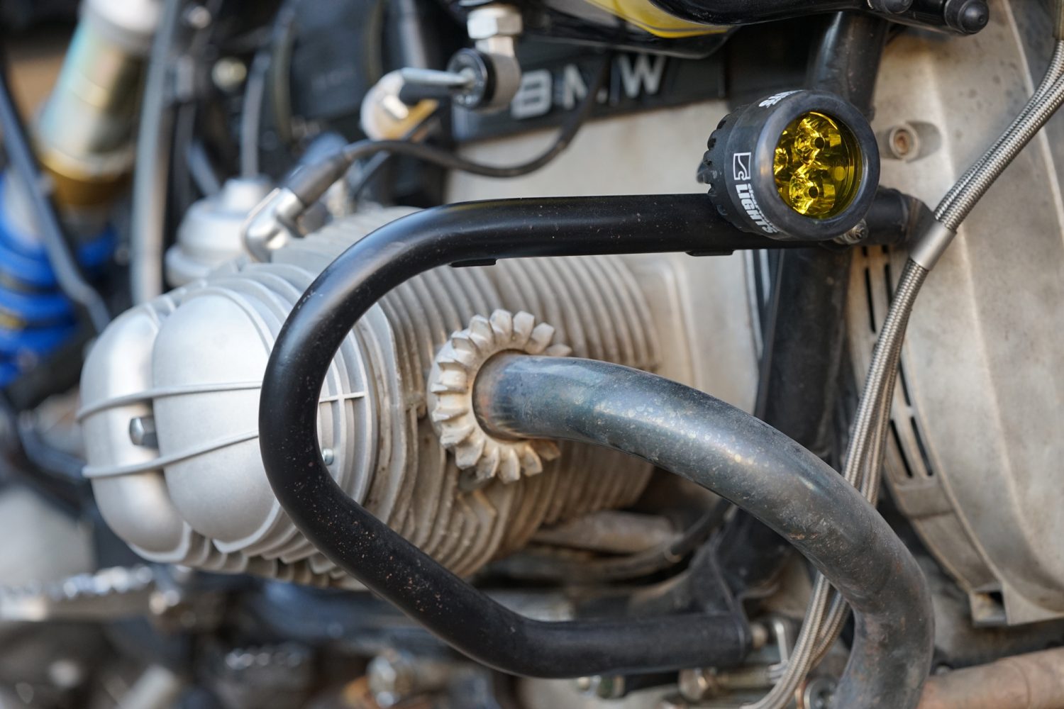The stainless exhaust’s throaty roar is more like a large displacement thumper and provides excellent auditory feedback. The suspension and brakes will require more road and trail time under load to maximize the setup’s capabilities. We re-jetted the carburetors twice, and they seem very responsive across the RPM range. On an older bike, Clearwater’s Darla lights drastically improve the riding experience. Mosko Moto’s Scout 25-liter panniers easily adapted to another manufacturer’s rack, and the Scout 30-liter duffle fits perfectly on the R 100 GS-PD cargo rack.