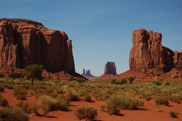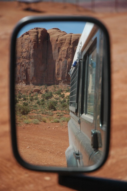 Soon we were brought back to reality. We were running low on diesel. After 150 miles, we arrived at the ferry that would take us across Lake Powell to Hall’s Crossing, UT. We had counted on finding a gas station there. Gazing around from the ferry deck, we realized our mistake. Besides a few simple holiday cabins, the sparkling Colorado river was surrounded by bare hills without any sign of a gas station. After the ferry crossing, civilization was lost again. Now we were getting nervous. The fuel gauge was pointing straight down to red, and then the warning lamp lit up. I cursed us for not filling up extra tanks. If we ran dry, simply filling up with diesel would not solve the situation. We would have to be towed. According to our map, we were reasonably close to a small town called Mexican Hat, UT. All we saw, though, was a spectacular desert with red sand and cliffs stretching out to the horizon. Breathtaking to say the truth, but things were too serious to take time to admire the scenery. There was no sign of a house, let alone a gas station. There was nothing else to do but continue. We turned off the air conditioning, rolled up the windows and drove 55 miles an hour to save as much fuel as possible. After several miles through the empty desert, we spotted an enormous cliff in the shape of a sombrero – the Mexican Hat that we had been yearning for! We cheered in relief and happiness. Breathing the last fumes, the Defender rolled into the gas station. One tank of diesel had taken us more than 400 miles: From Boulder to Mexican Hat, including some detours, and mainly in poor road conditions. Diesel definitely takes you farther than gas. As we parked next to the pumps, I patted the car – well done, mate.