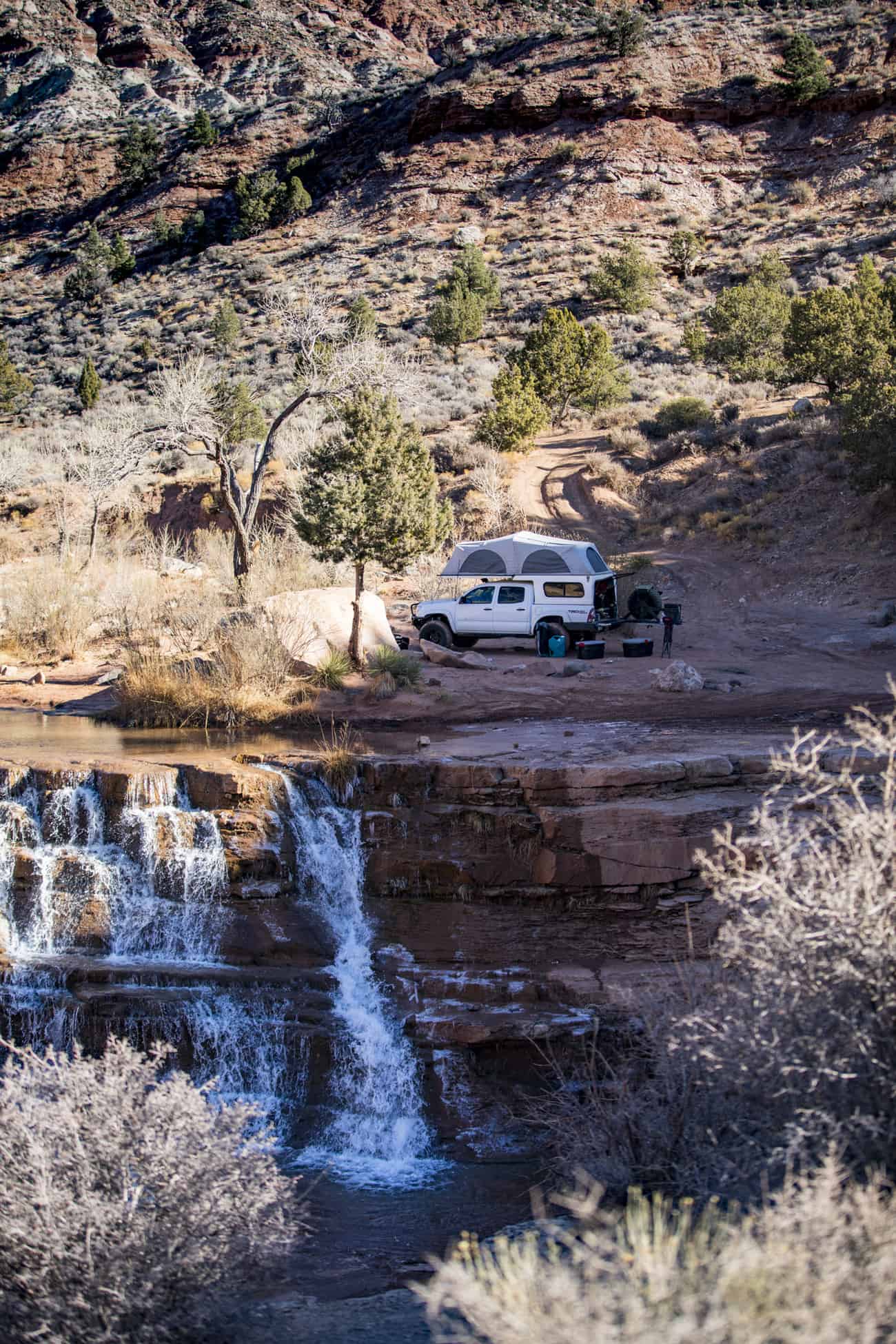 It was cold that first night. You can see the glow in the bed of my truck, in the photo above, of my Mr. Heater Buddy pre-warming the Flippac. Charlie and Theo slept on the ground tent for the first and last time of the trip that night. Sleeping on an air mattress proved to be too cold for them, so for the rest of the trip they moved into the flippac with us. We got up, made a good breakfast, and explored around the falls as Charlie had never been there before. After exploring the falls we took the low trail out, which not many people do! It’s a fun trail that can be difficult depending on water/mud level, and takes you in and out of the creek below.