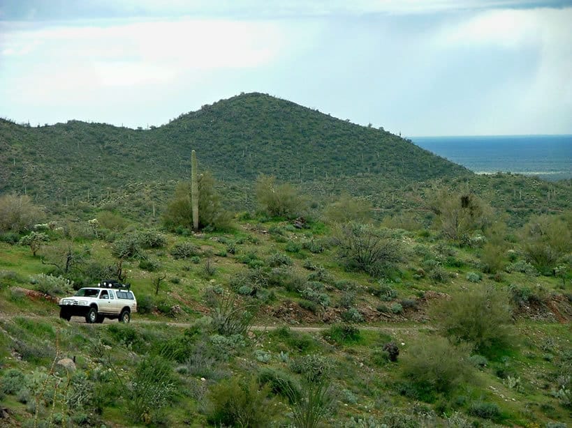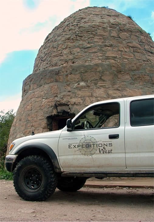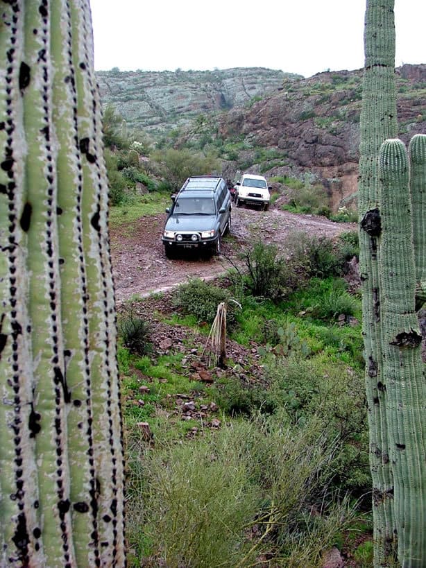 The rain started to fall heavily at 8:30 am, sending the participants of AZRocks running for the cover of tarps and their vehicles. The wet conditions changed many of the run plans, and I suggested a group run to the Coke Ovens and out through box canyon. It is a relatively easy trail, made somewhat more difficult by the water. Several other drivers were up for the route and lined up. We left camp under a downpour with seven vehicles.