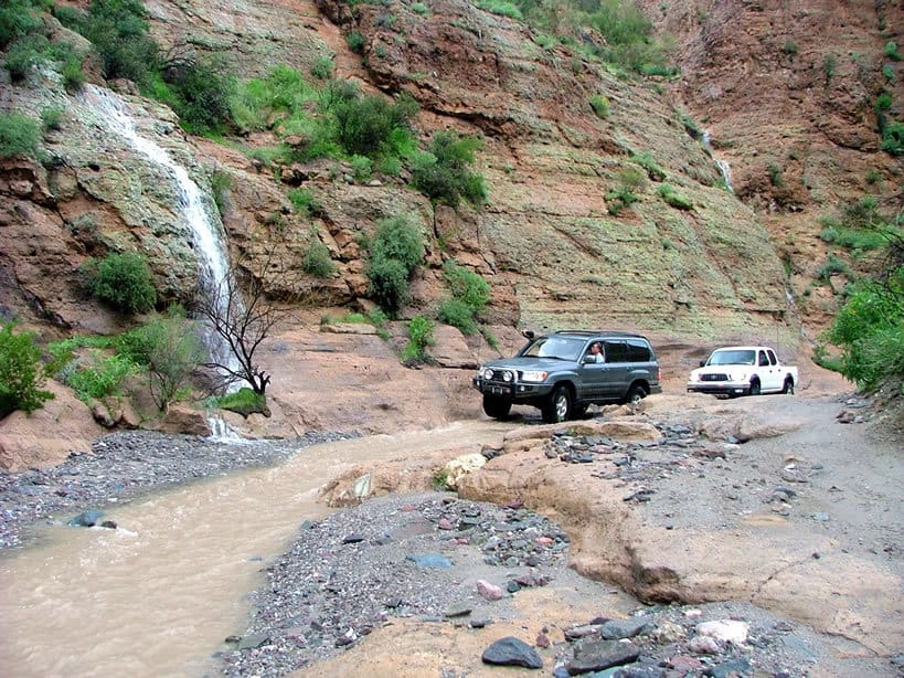 As we drove through the canyon, waterfalls cascaded down the steep walls, splashing into the muddied waters below. Though we were moving quickly, we still stopped for several pictures and to spot the stock vehicles down the rock ledge and through several tight sections of rock. The water makes judging the trail more difficult as much of the surface and size of the rocks were obscured.