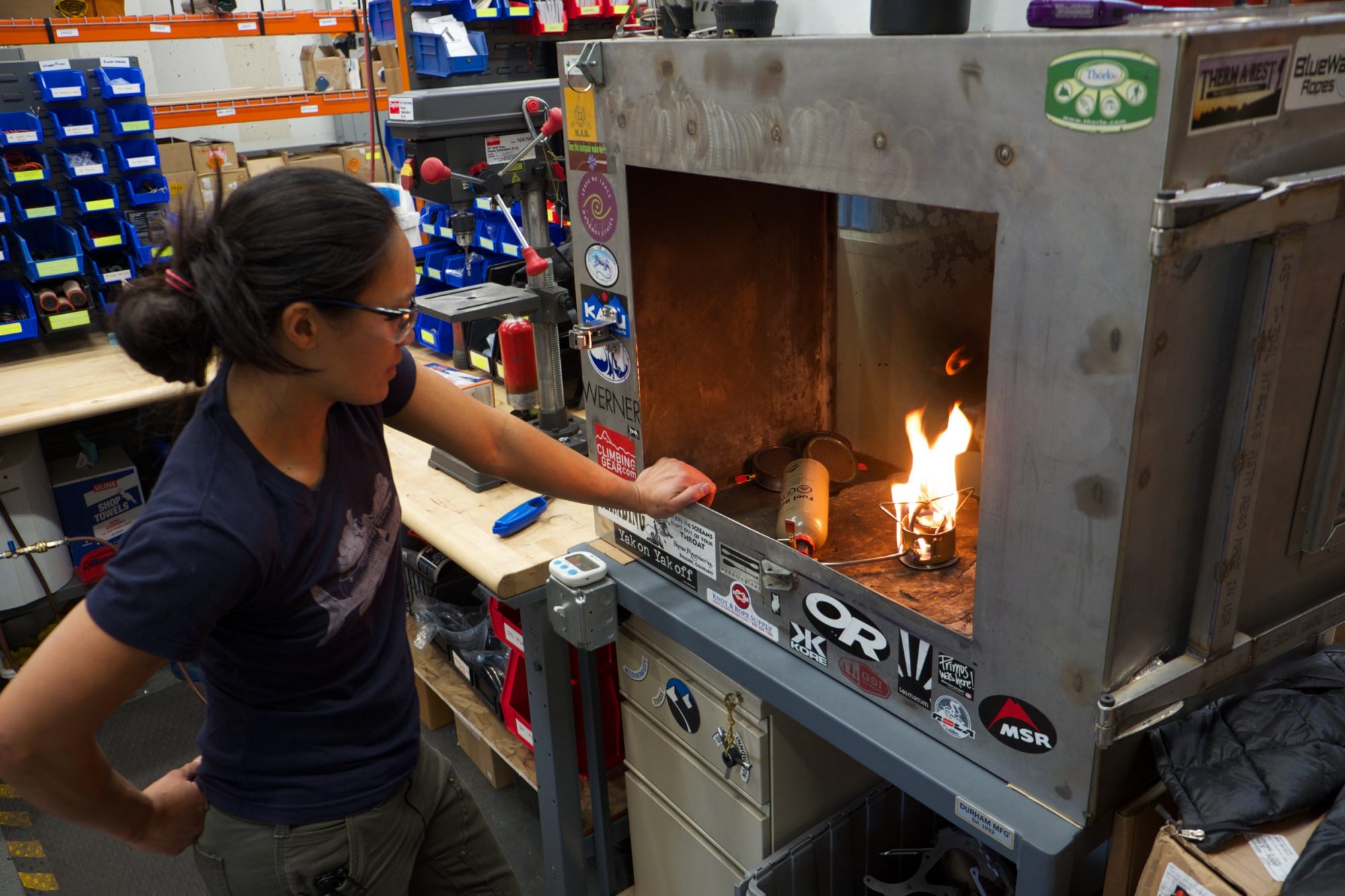 In virtually every corner of the facility there were engineers crafting the tools required to make the various components for snowshoe bindings, sleeping pads, and water filters. In other nooks, people were diligently torture-testing products to replicate the offenses of the most ham-fisted user, or inspecting each product individually to ensure it met strict quality control standards. Every stove is fired and every filter tested. In another corner of the complex a hulking steel structure houses Cascade’s own cold chamber used to accurately test the temperature retention of sleeping bags and the insulation values of sleeping pads. Nothing is left to chance.