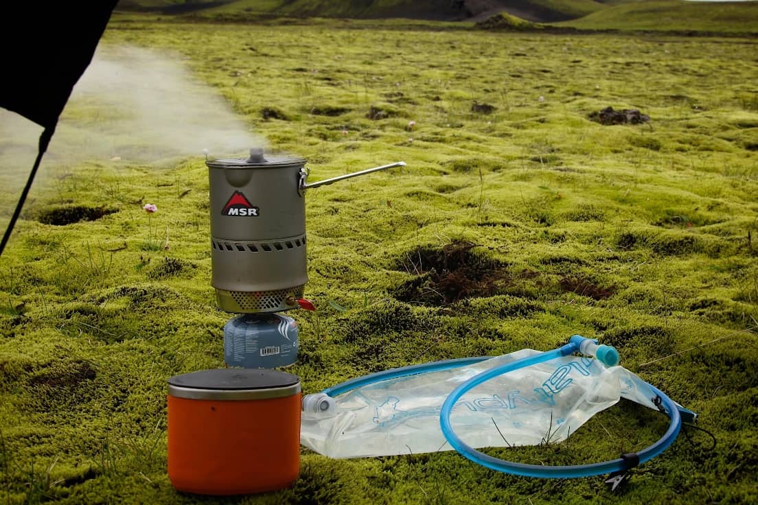 Breakfast in the Highlands of Iceland with my Reactor stove, Platypus Big Zip reservoir, and insulated mug.