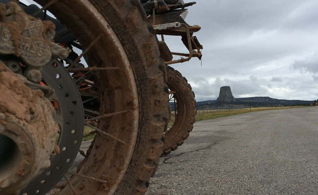 Josh and I loaded up with paper maps, a dry pair of gloves and hopes of finding Devils Tower by way of mostly off-road trail. It is never fun walking from the dry to the pouring rain to throw a leg over the bike for the day. That first sense of getting wet hurts the ego and drowns motivation until you finally get on the road. The first few trails we hit were closed by recent mining. The trail would just disappear and be blocked off with fences that warned of trespassing consequences. A few re-routes and we had made it to what is often referred to as a B Road. Not maintained except for the occasional tires that knock down the grass, this road looked muddy. Josh looked back and said, “It’s only a short distance to the road from here.” He was right. Approximately 1.5 miles in distance, this road seemed to be the biggest challenge of the entire trip. Ruts dug deep from farmer’s 4x4s and tractors were filled to the brim with water. “How deep?” was always a question that slammed front of mind as my bike slid off of the center of the high ground I tried so hard to maintain.