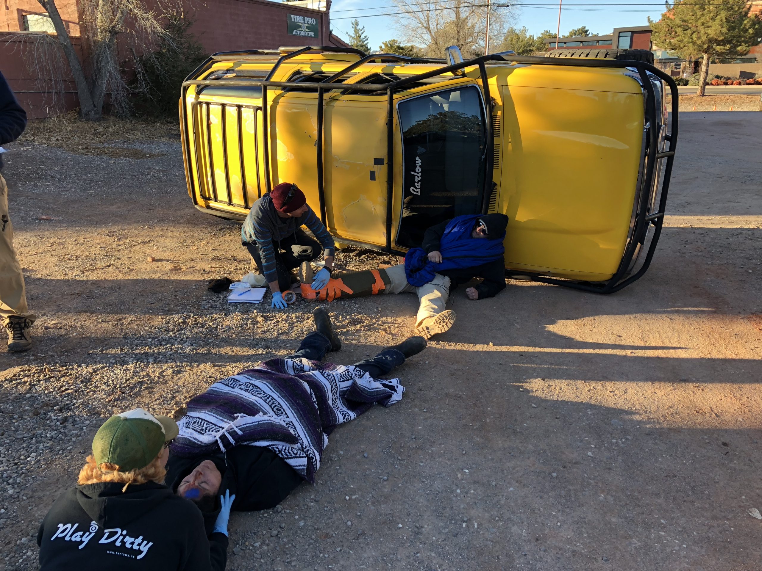 Staged photo. You may not be the best medic or mechanic, but it’s good to have people in your party that possess at least basic training and experience in those skills. This photo is a set up scenario combination of medical and mechanical all in one at our Barlow Wilderness First Aid course.