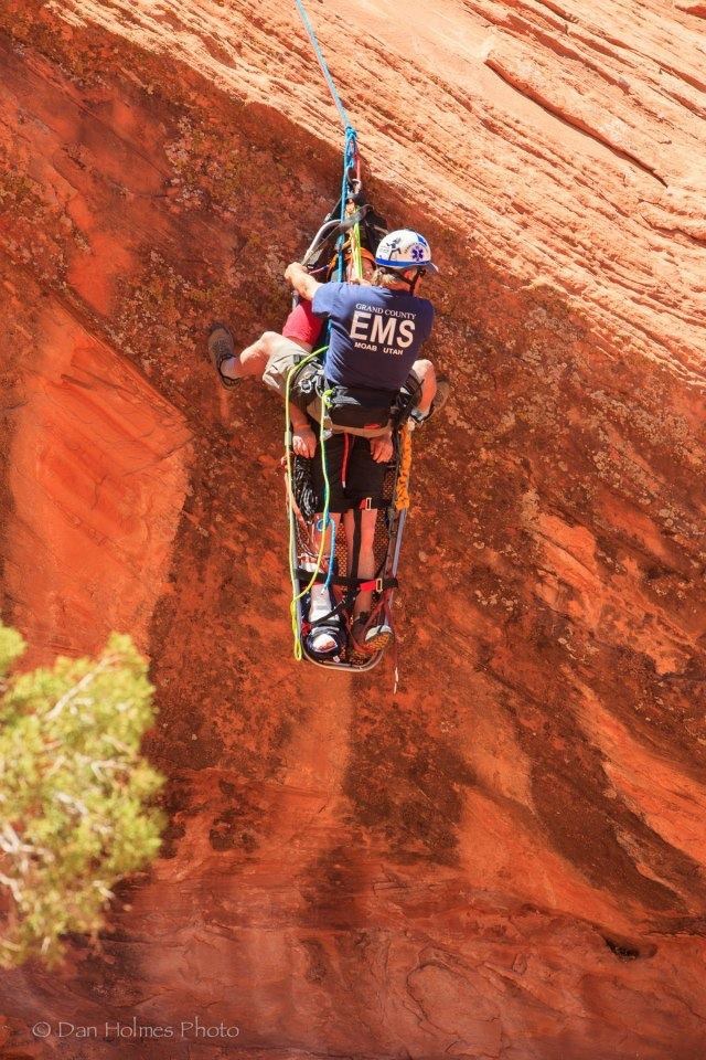 John Marshall descending a cliff with a severely injured victim of bad choices. Grand County SAR is one of the most trained and skilled units in the country, and it’s because they get a lot of practice and on-the-job training. Photo by Dan Holmes