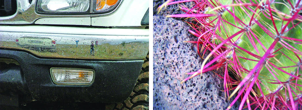 The last few miles to Tule involved the most technical driving we had encountered in the area, as it required turning east off of the main track and farther into the foothills of the sierra via a smaller track. Several pronounced lava fins broke the rhythm of the trail, and our convoy slowed. Loose boulders demanded a fine touch on the throttle and lower air pressure to prevent them rolling out from under the tires and grounding the vehicle. Within a half-dozen miles, the track terminated on a small mesa, and just beyond it a crevice cut through the magma’s surface where it captures the watershed of Cerro de Santa Clara.