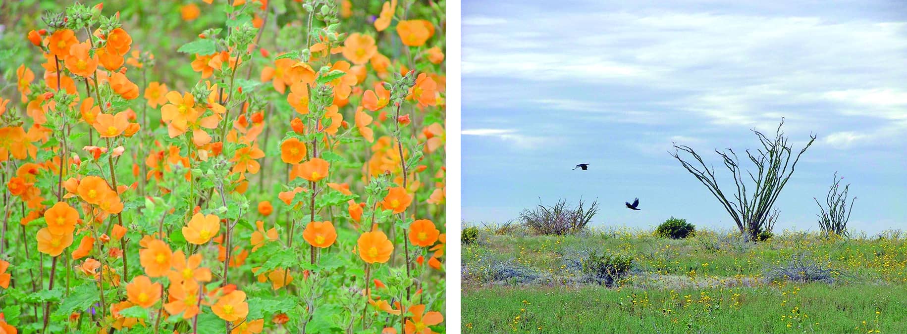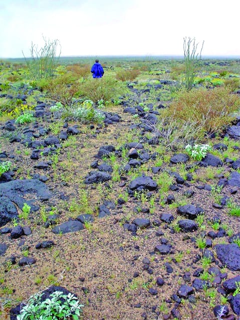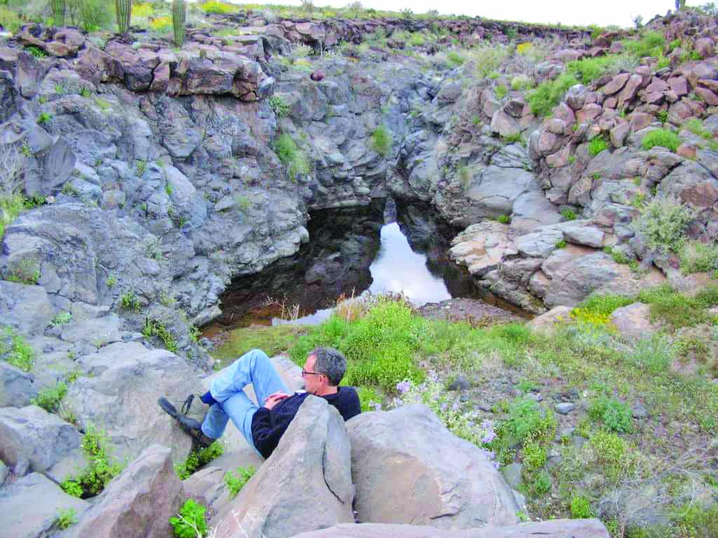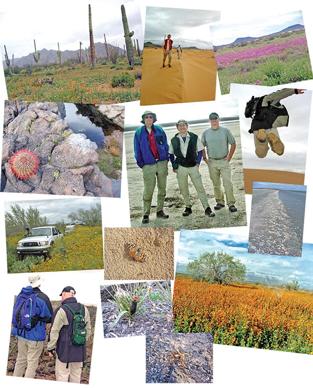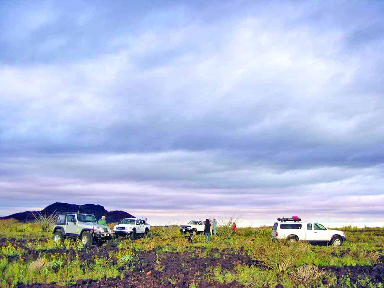 A series of unimproved trails connects most of the craters, which bear names from the Hornaday expedition, including MacDougal and Sykes Craters. Winter rains had brought the desert to life, and the area we expected to be parched and lunar rewarded us with six-foot-tall, brilliantly orange mallows intermixed with purple verbenas and glowing white evening primrose. The air was sweet with the scent of moistened creosote, and our progress slowed as the photographers captured the spectacular, rare bloom. Our first stop was at Papago Tanks, where Father Kino had watered in 1698. Navigation became a significant challenge after Papago Well, as the track was disguised by a sea of color, on several occasions requiring spotters to search for the route on foot.