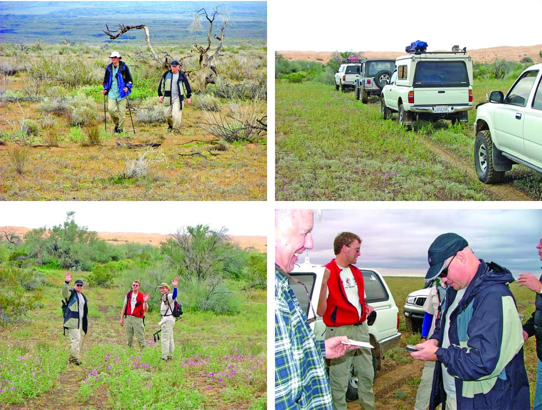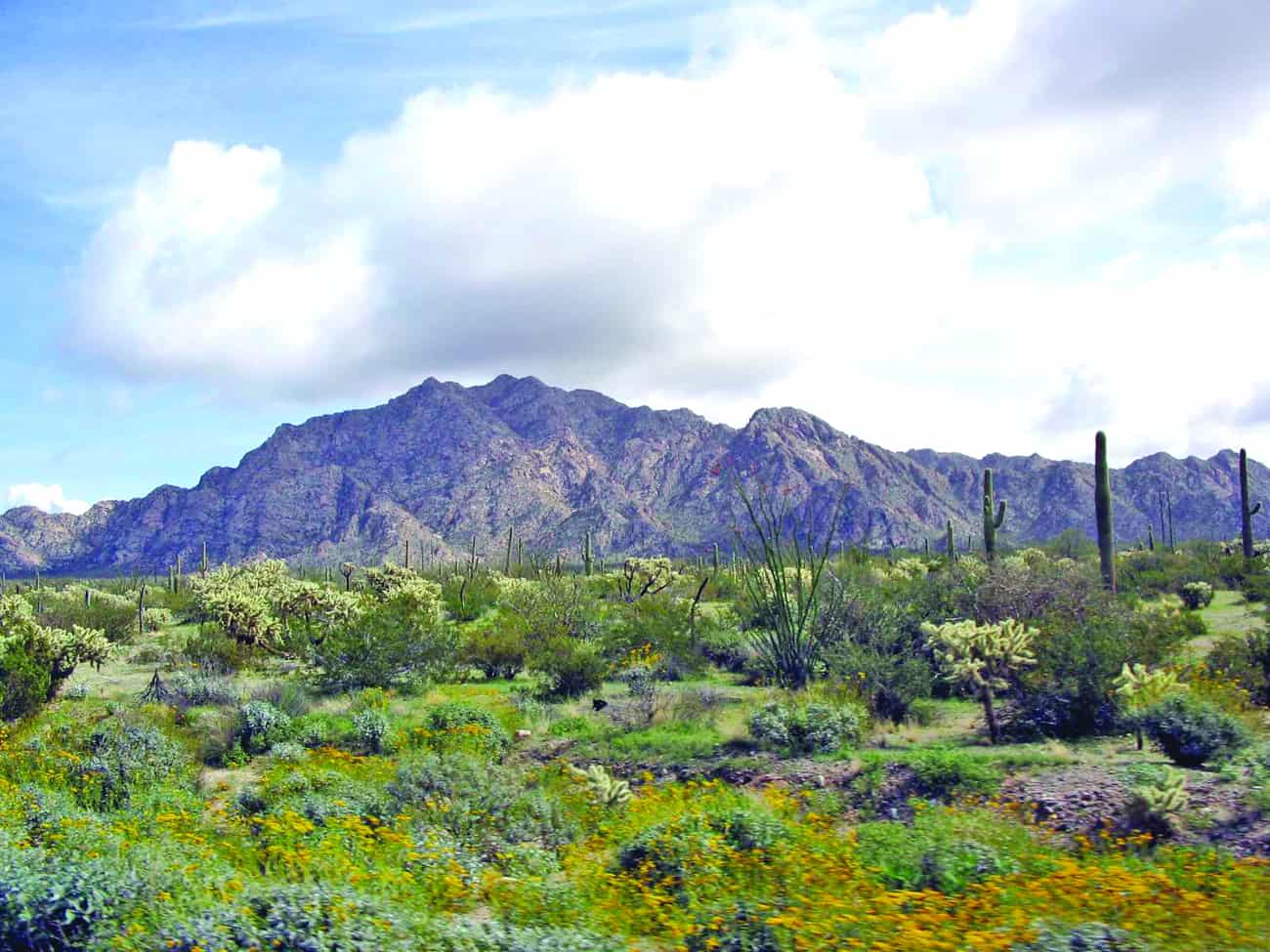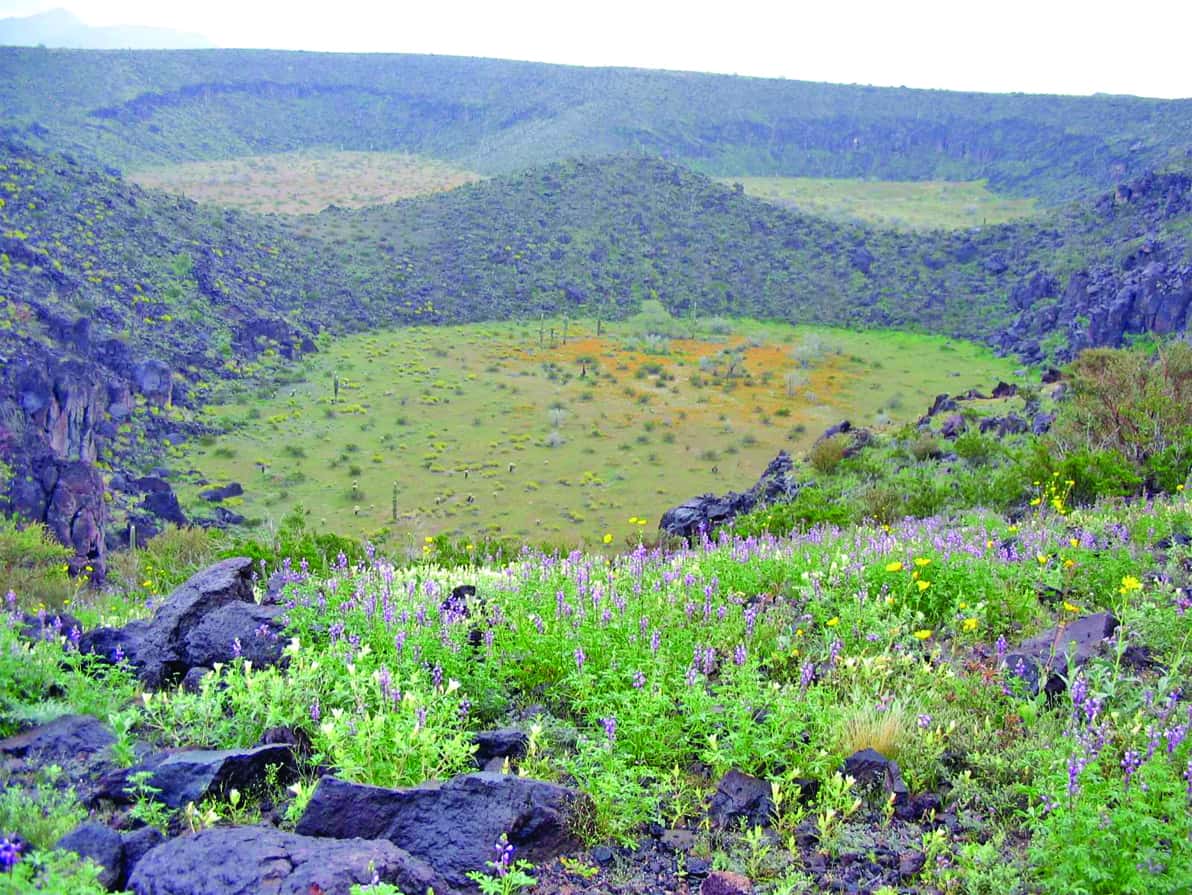 A series of unimproved trails connects most of the craters, which bear names from the Hornaday expedition, including MacDougal and Sykes Craters. Winter rains had brought the desert to life, and the area we expected to be parched and lunar rewarded us with six-foot-tall, brilliantly orange mallows intermixed with purple verbenas and glowing white evening primrose. The air was sweet with the scent of moistened creosote, and our progress slowed as the photographers captured the spectacular, rare bloom. Our first stop was at Papago Tanks, where Father Kino had watered in 1698. Navigation became a significant challenge after Papago Well, as the track was disguised by a sea of color, on several occasions requiring spotters to search for the route on foot.