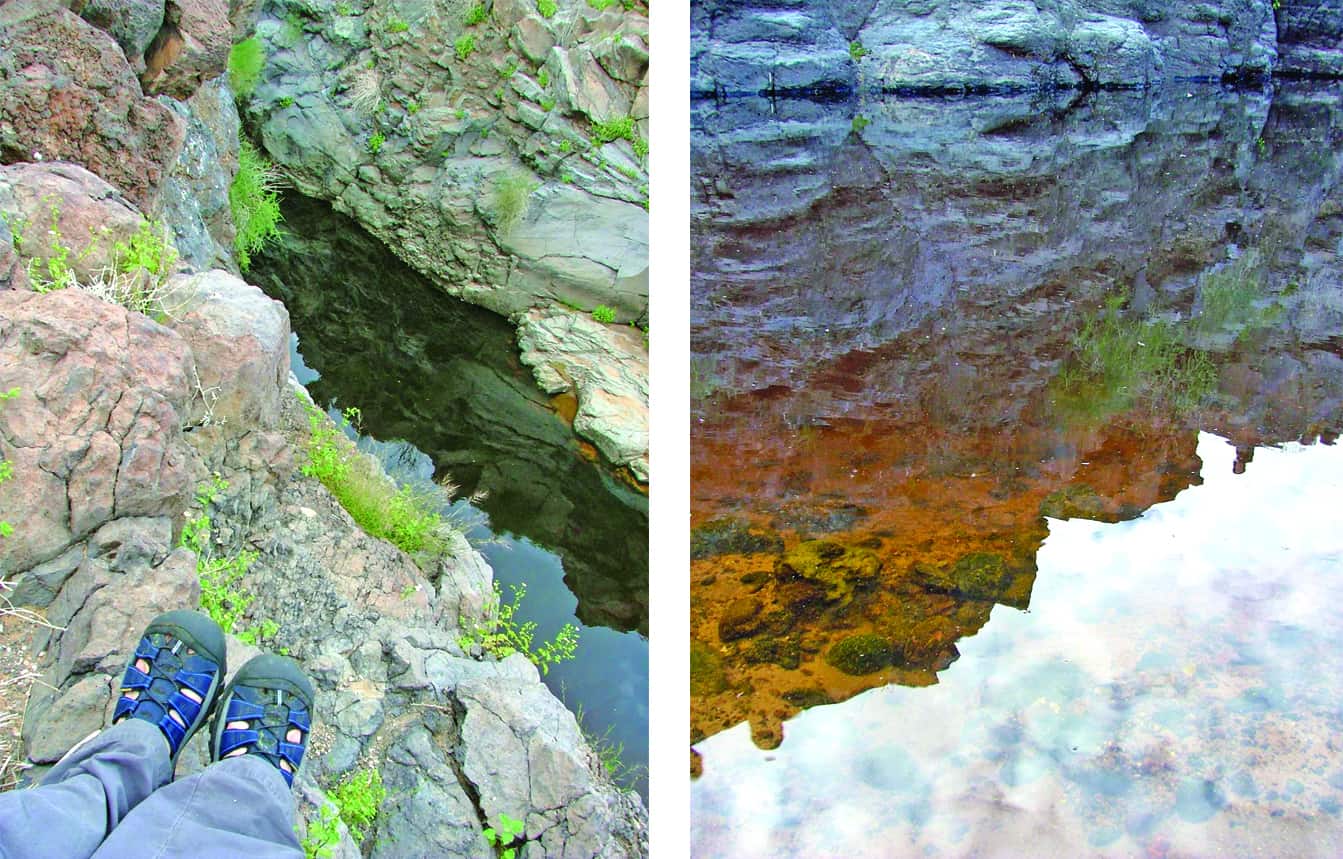 Within moments of leaving the truck and walking to the tank’s edge I was struck with a sense of connection to the place. It seemed intimately comfortable and familiar, which in a way it was, since I had read every available text on the location and spent several anticipation-filled months daydreaming of this adventure. The tank was large, like a huge, rectangular swimming pool, and quite different in structure than Papago Tank, with its entire contents confined to a single, deep pool. A sandy approach lined the southern end, the slightly muddied surface revealing the footprints of bighorn sheep and a small cat. The rocky rim was as much as 15 feet above the water’s surface in places, and lined with palo verde trees and barrel cactus. From even 100 yards away, a passing traveler would be completely unaware of this life-saving oasis.