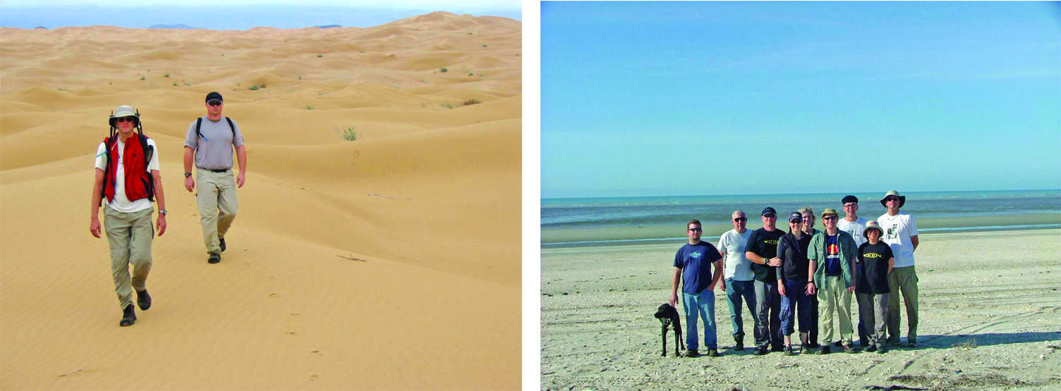 Progressively, the dunes became smaller, and we got our first glimpse of the sea. It was quite a milestone for us, and quickened our pace as we attempted (poorly) to glissade down the last large dune face. The dunes give way slowly to a long, flat, sandy plain, which gradually yields elevation toward the sea. We could see the waters of Bahia Adair and small segments of the soda deposits in the distance. I considered what Sykes would have thought as he neared the coast, having traveled with none of the modern conveniences, no radio, no Camelbak water bladder, no technical clothing or lightweight trekking boots. His accomplishment impressed me most while walking in his footsteps, and I was further humbled by the knowledge that we had only completed half of his journey, that Godfrey would have reached the water’s edge, taken a few aneroid readings, and then turned around, trekking another 18 miles back to the camp at Tule Tank.