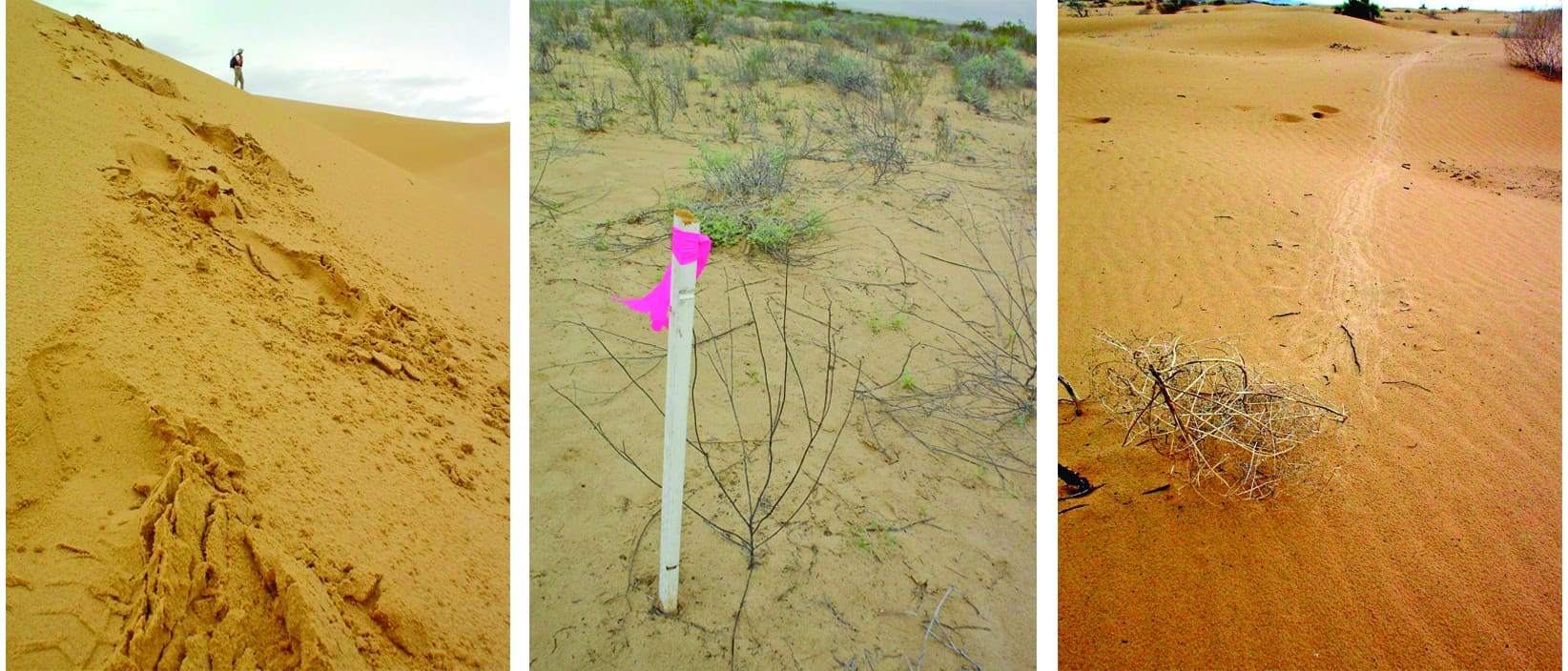 My wandering thoughts were quickly broken by Uwe announcing that he had found tire tracks. At first we thought it was some random off-trail incident, but soon we found a series of wooden stakes set in the sandy soil, bright pink ribbons tied around the top of each post. These were survey markers, signaling the planned roadway that would bisect the Altar and herald a new era of access for vacationers to the northern coastline. We had celebrated a centennial anniversary of these great explorers’ trip to one of the last remaining blank spots on a map—a true tierra incognita, or unknown land. Chris, Uwe, and I were likely among the last explorers to cross these great dunes before the road was built. Times are changing in the land to the south, and the time to explore its treasures is now.