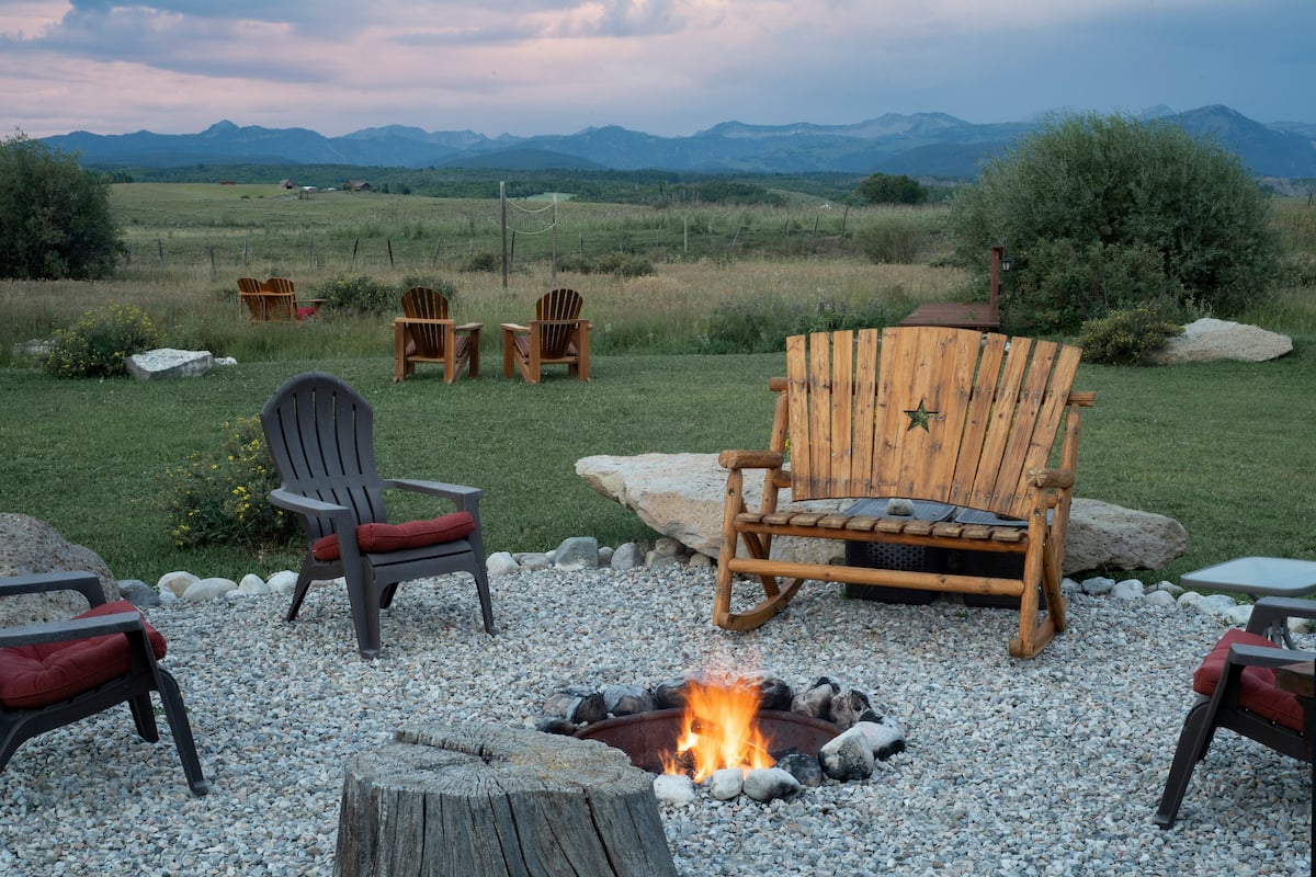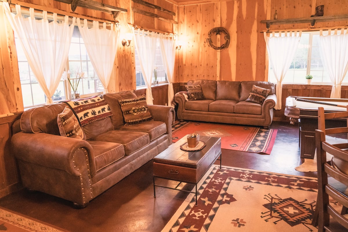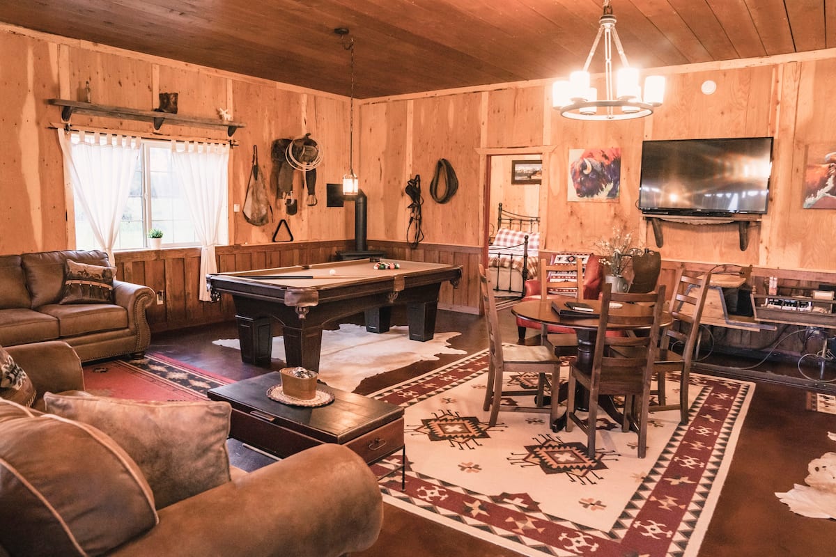 The cabin is outfitted with a queen-sized bed, pull-out couch, fireplace, and a pool table. There is also an outdoor saltwater hot tub, a fire pit, and multiple outdoor seating options for taking in the spectacular views. Additional amenities include a full kitchen, washer and dryer, television, WiFi, and dedicated workspace. Between its two beds, the cabin can accommodate up to four guests.