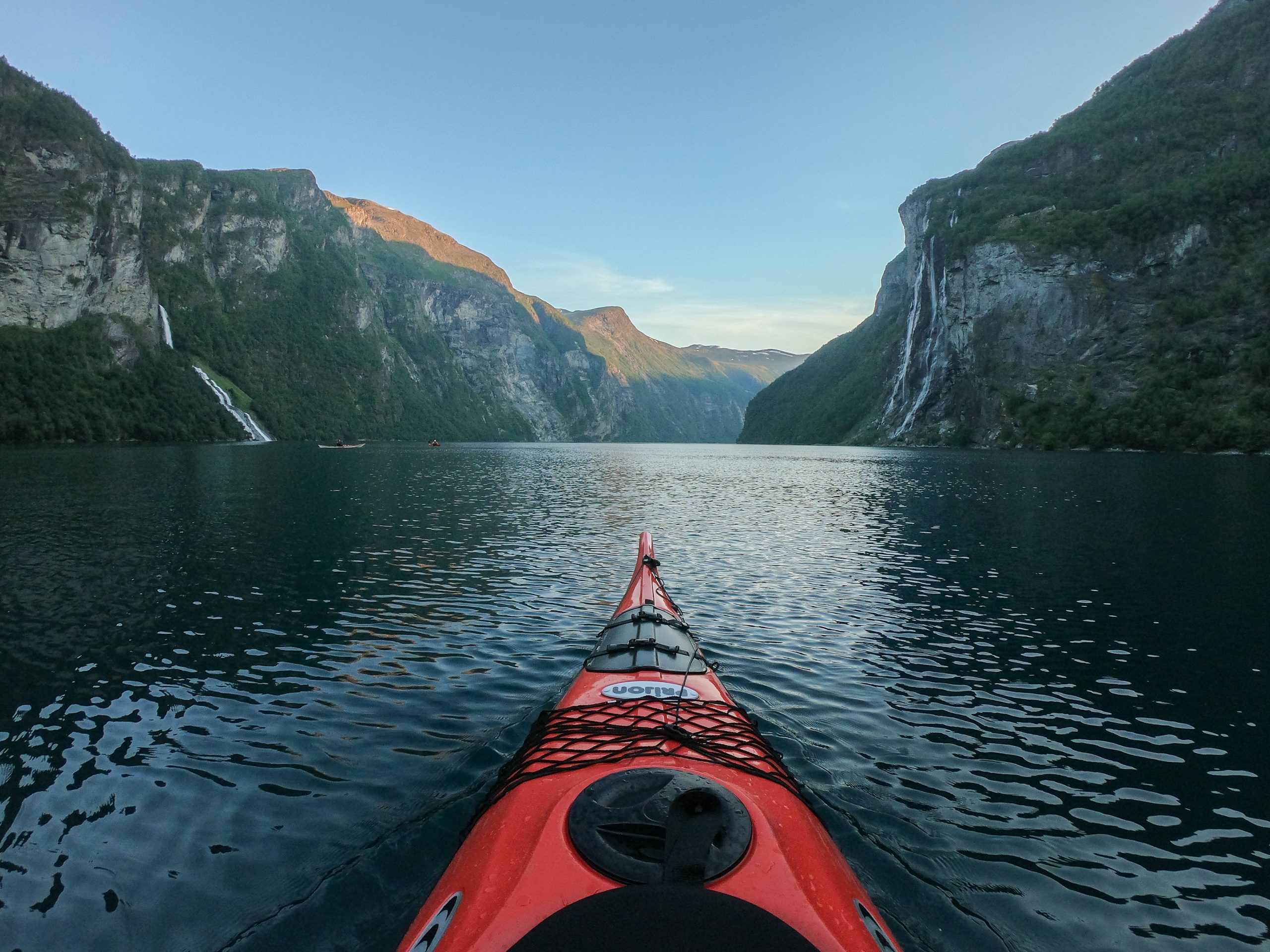 There are numerous activities on offer, including fjord cruises, guided RIB boat tours, mountain biking and hiking tours, climbing, kayaking, and more. During my last visit, I brought my sea kayak and paddled out with some friends to the incredible 410-meter Seven Sisters waterfall; I highly recommend you do the same. From the water, you really feel the scale and sheer enormity of the fjord, which is over 250 meters deep and surrounded by 1,600 to 1,700-meter peaks.