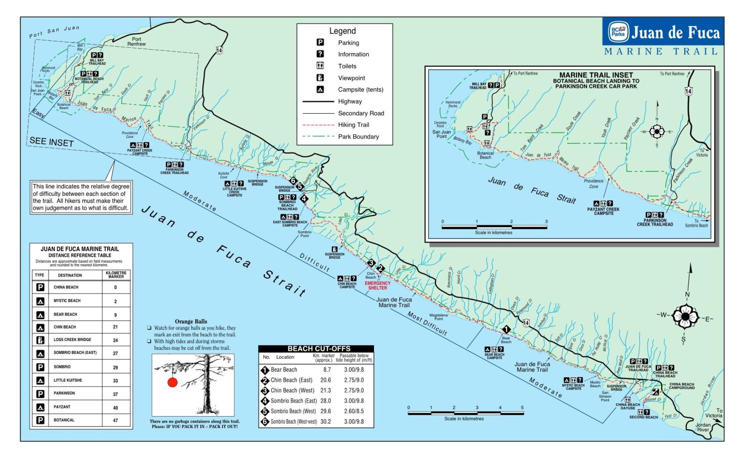 If you’re itching to ditch your vehicle, several walk-in beach and forest sites are available for tent camping. A permit is required ($10 CAD per adult per night and $5 per child per night); purchase yours online via the BC Parks Backcountry Registration System. Beach camping is permitted at Mystic Beach, Bear Beach, Chin Beach, and Sombrio Beach (East). Campers are required to use designated sites at West Sombrio. Forest sites include Little Kuitsche Creek and Payzant Creek. Fires are not allowed at these locations.