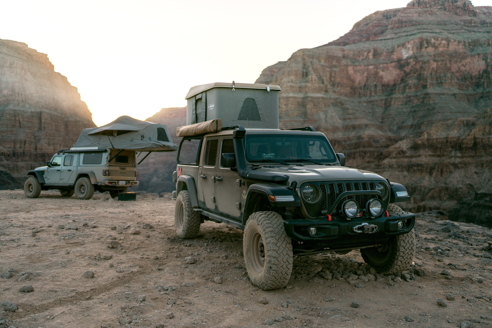 The sun dipped below the horizon hours ago, but we’re still driving. The Gladiator’s off-highway lights cut through clouds of dust, abruptly pitching up and down with the front end of the rig. I swallow two painkillers to stave off the pain behind my left eye—my own fault, and the consequences of neglecting calorie and fluid needs. The final descent into Whitmore Canyon feels endless, but eventually, we encounter a flat bench 1,000 feet above the Colorado River, with room for our five vehicles: Camp.