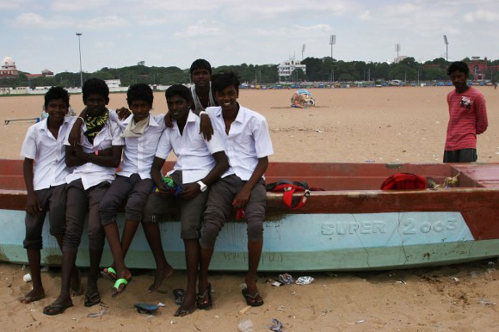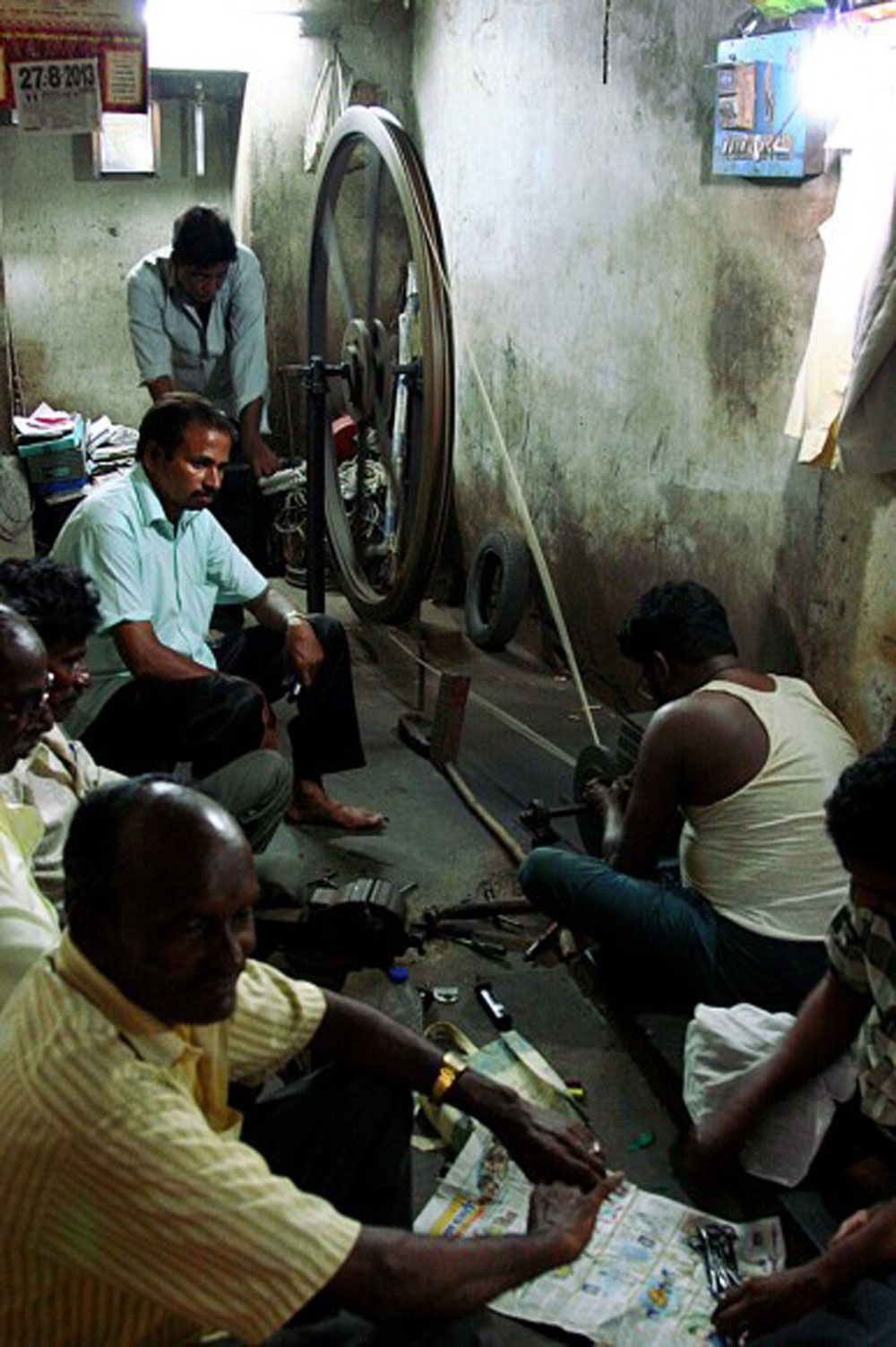 And then there were the people. People watching in Chennai became our favorite pastime while we waited for Nacho to arrive in the port. Each day we would emerge from our hotel with the camera in search of people. Four shops down there was a hole in the wall where men sat around a crude machine. One man cranked a large wheel while another sat on the ground sharpening knives and scissors against a spinning piece of stone. Seeing my camera, they invited me inside, told me the story of how Ghandi used to spin thread for his own clothes, and let me take a bunch of photos. Next door a young man stood proudly in front of his briyani pot, spooning portions into steel bowls for his hungry clients at fifty cents per meal. He asked me to photograph him serving up some briyani, and then offered me lunch. On the next block, peering into an open gate revealed a young girl in her school uniform watching the boys exercise in the yard before class. When I turned to leave, a beautiful woman who was seated on the curb asked me to take her picture. And down the block the story continued.