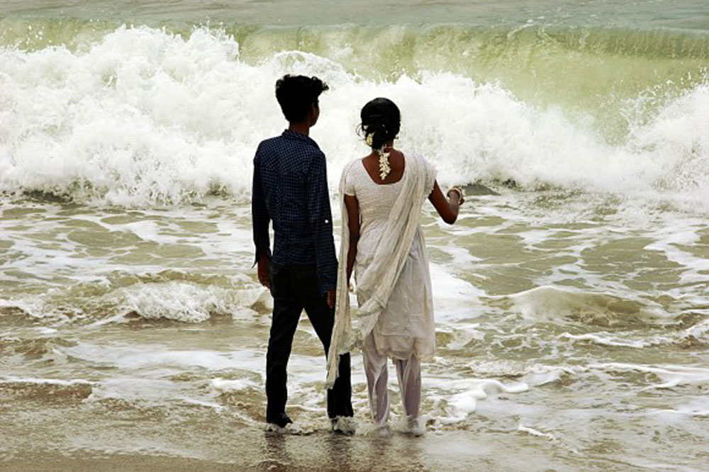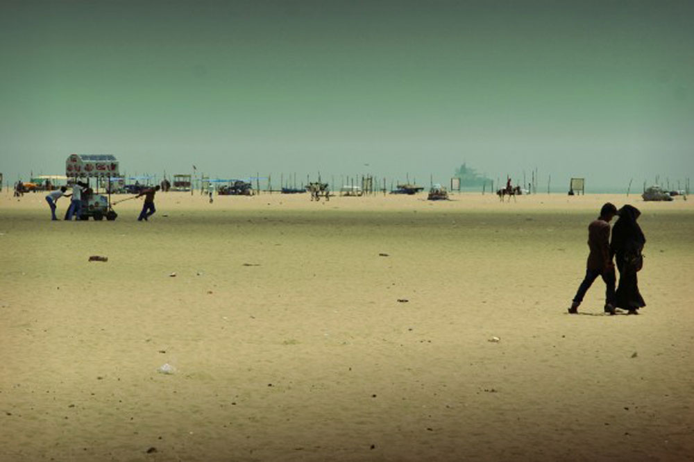 But the intrigue that strangers feel for us is both a blessing and a curse. One afternoon we walked from our apartment to the beach. Along the way we met a homeless family, and we made small talk. They were thrilled when we wanted to take their photo, and excitedly handed Sheena their bare-bottomed baby for the occasion. Arriving at the beach, we walked a hundred meters across the sand where mobile popcorn stands were painstakingly dragged through the deep sand, young Muslim and Hindu couples strolled, and people huddled in the shade of the dozens of abandoned wooden carts dotting the sand.