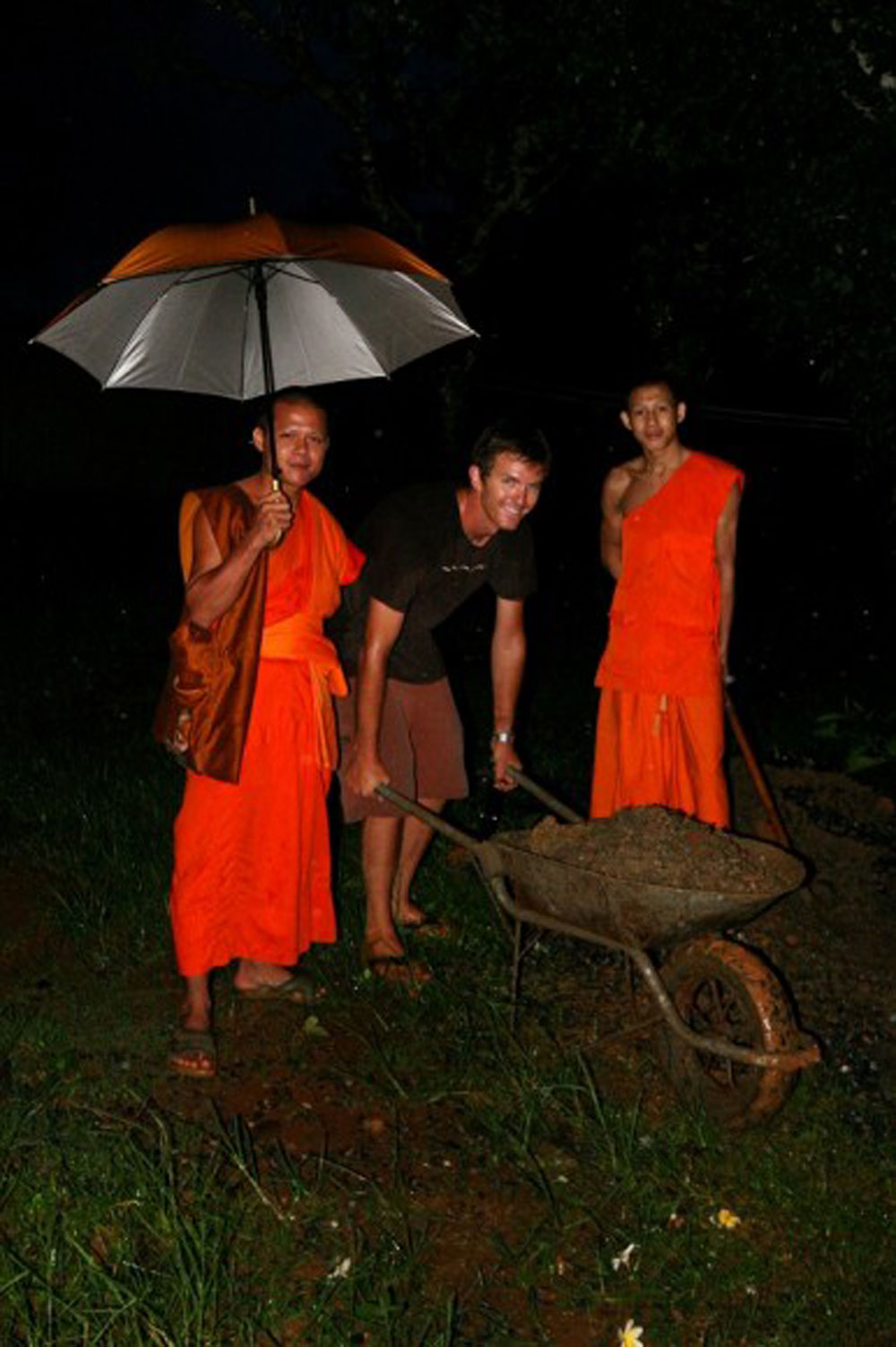 As we parked, the monks streamed out of the temple, picked up two wheelbarrows and an array of shovels, and went to work filling the bomb blast craters in their driveway. I grabbed my shovel and joined the effort. Buddhist monks are happy people, always smiling, but I have to believe that they must have thought that we were a huge pain in the ass. We finished filling the holes, the monks smiled at us, and they retreated.