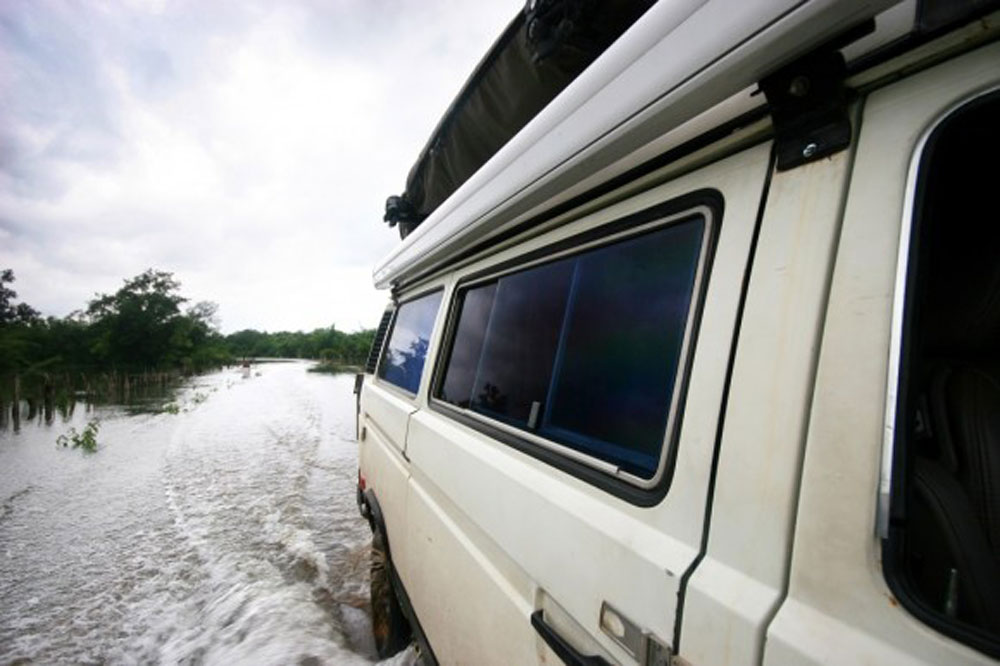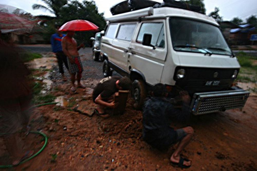 After five or six monks had read my note, each giggling a little bit and passing the note on, the paper landed in the hands of a monk who knew the English word “yes”. Riding high on the sweet endorphin wave that success brings, I floated back to Nacho, hopped into the front seat, and started lying to Sheena about how charming I had been when dealing with the monks. I threw it into drive and lurched forward. Almost immediately our front wheels disappeared straight into a hidden mud trench, and our bumper slammed to the ground.