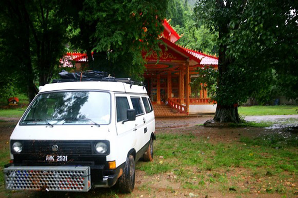After descending the mountains beyond the landslide site we arrived in a small village in heavy rain just as evening set in. We asked around at a couple of huts to see if we could park for the night, but were pointed in the direction of a temple. Sheena wailed her disapproval at the idea, but after convincing her that it was either this or on the side of the road, she grunted, crossed her arms, and silently agreed. I parked Nacho in the driveway of the temple, grabbed the paper from our dashboard that a Laotian man had written for us, which asks in Laos script if it’s okay for us to camp here for the night, and I headed into the monks’ house.