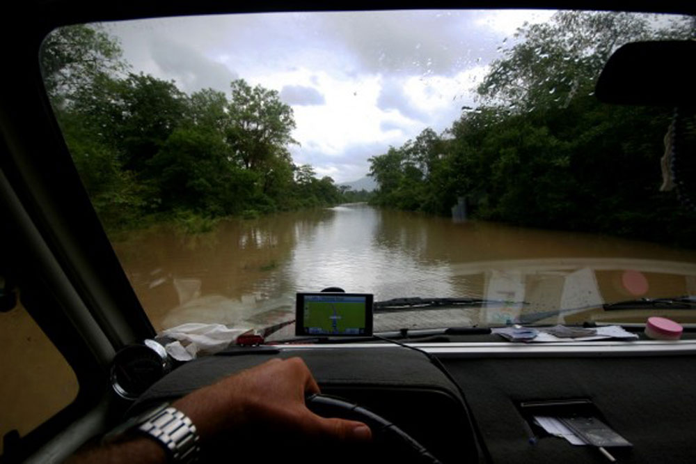 First, a man with a 4×4 Toyota Hilux fired up his truck and timidly approached the slide. He steered off the road, toward the thick vegetation separating the road from the bottomless abyss of the deep canyon below. He gunned it, slid all over the place, spun his tires, flung mud, and just by the skin of his teeth managed to get his truck back onto the road before either rolling or sliding off into oblivion. The confidence of the people had been aroused, and a few other Hilux owners followed suit. The Hilux is a popular truck in these parts. Soon, a crazy bastard in a two wheel drive sedan tried and succeeded. I stood there for many minutes studying the best lines, noting the obstacles hidden by the deep river that had formed in the right tire track, and visualizing Nacho’s triumph over this seemingly insurmountable challenge.