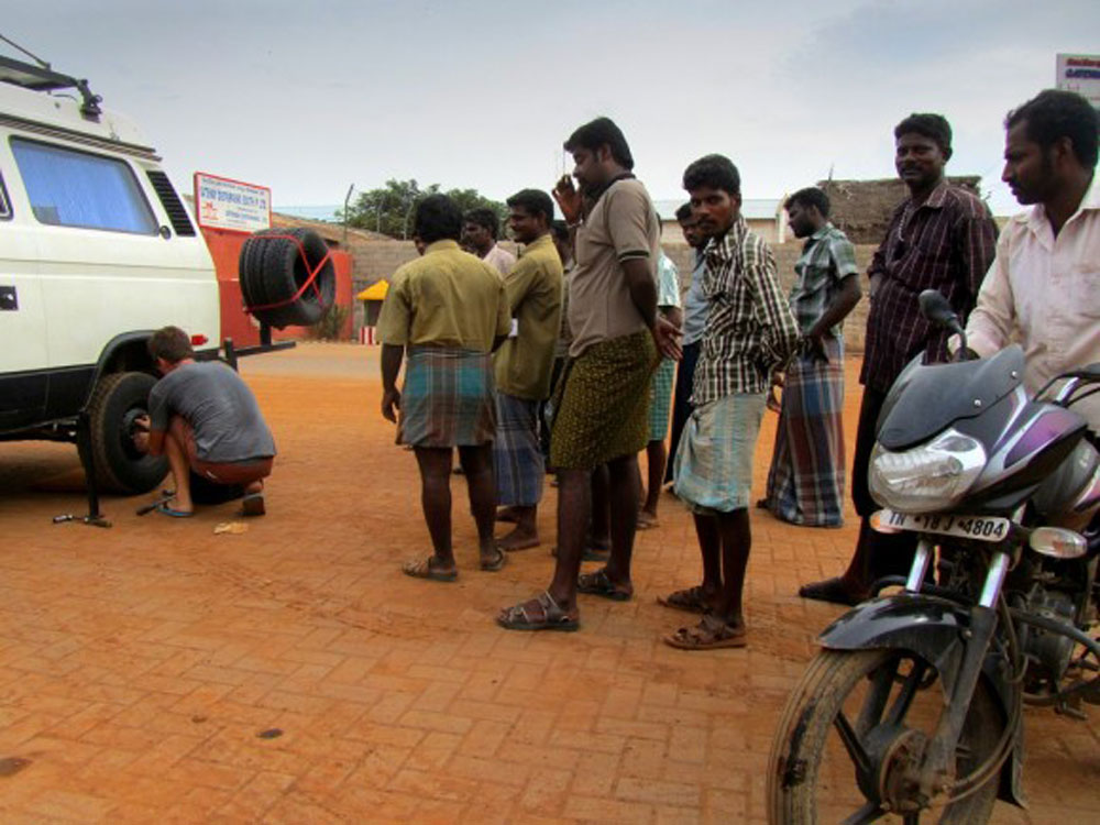 When I stood up to move to the next wheel I was shocked to find more than a dozen Indian men surrounding me, staring. I stared back, confused. Where had these people come from? This place is like the Twilight Zone. I walked over to the next wheel and the mob silently followed me, staring, as if witnessing for the very first time how man makes fire. I hunched at the second tire, and the mob stood directly over me, straining to see the pressure. They followed me around to each tire, and then waited in Nacho’s doorway as I found my tool kit. I crouched at the rear wheel, and the men stood over me. Nobody spoke. Occasionally I looked up or waved, but they stared back at me as if I were an alien. When I had finished I stood up, hot, sweaty, dirty, and hungry.