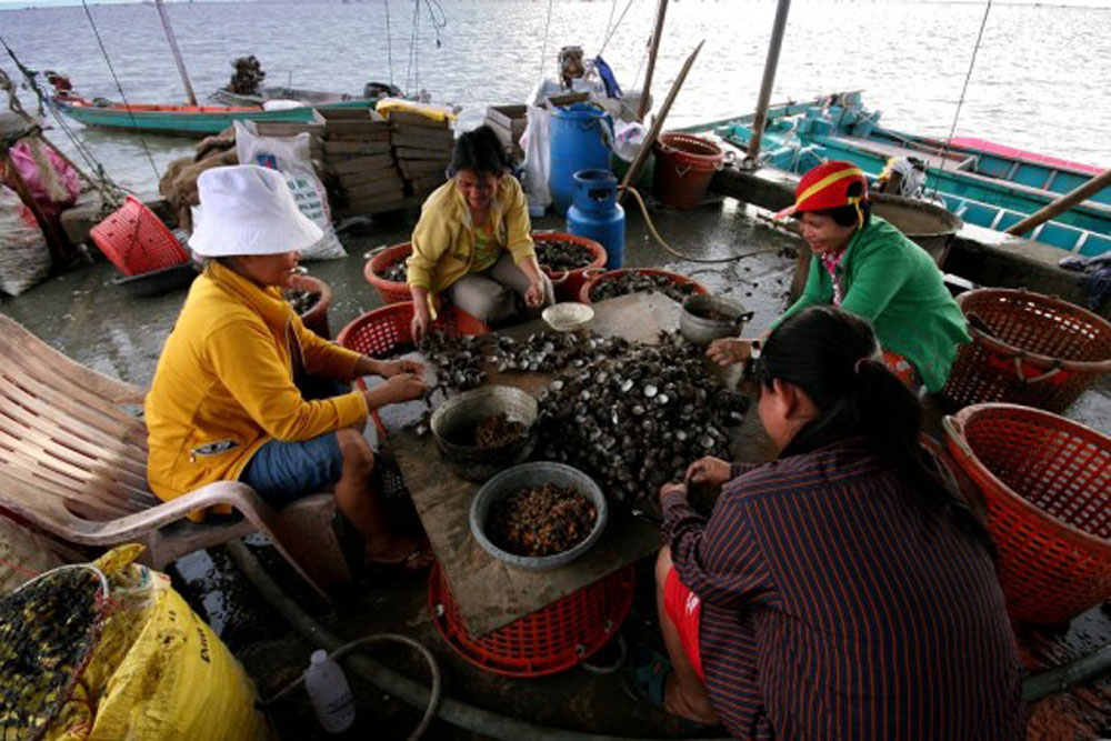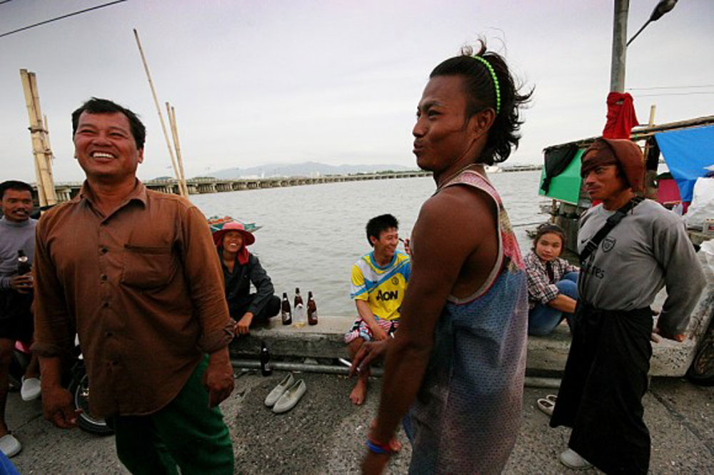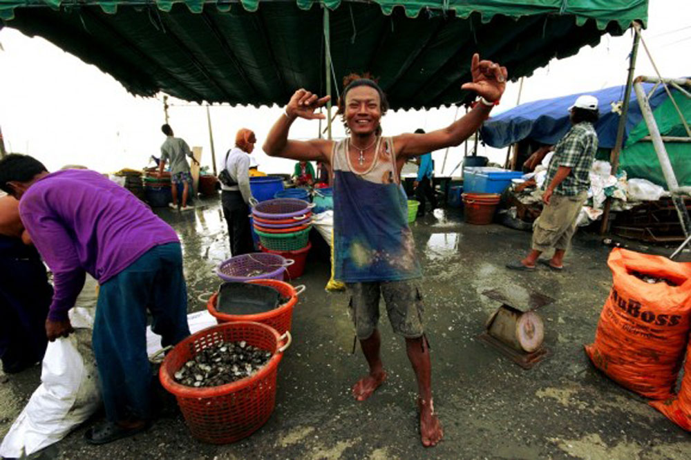 We wind through small beachside communities and pull off at an overlook above Chon Buri where we try to hide our intense fear of the monkeys that lurk about, and then we’re off again, toward the fishing wharves on the outskirts of Bangkok city. We find our way onto one of the docks and drive the bus out to the end where workers shuck clams. We’re welcomed by the happy workers, who tell us they’re from Burma. Several people collect the clam meat, while others place the shells in bags to be sold and ground down into bulk raw material.