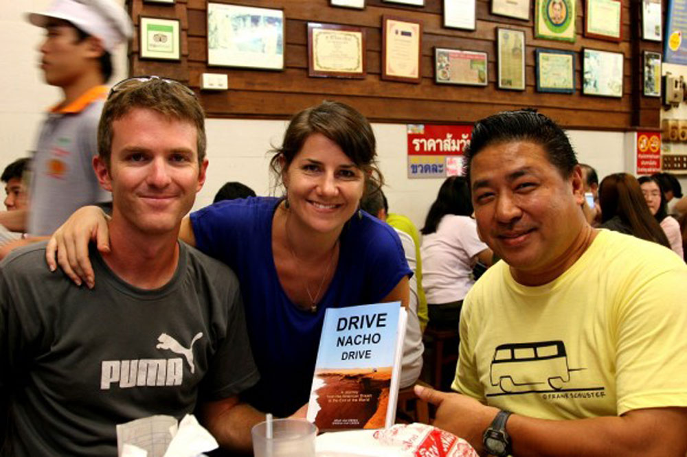 At the end of dinner, we ask Pat to read the note he’s made in our book. His family runs a publishing business, and he has run off a copy of Drive Nacho Drive for us to keep in Nacho’s onboard library. We had asked him to write something for us on our dedications page. He had started writing in English, but then switched to Thai script in order to fully express himself. “You can read it after you learn to speak Thai,” he says, and then reads it aloud. His words are the distillation of all of the kindness and friendship we’ve come to know in our group of Thai friends. We’ll keep it forever so we can always remember our friends.