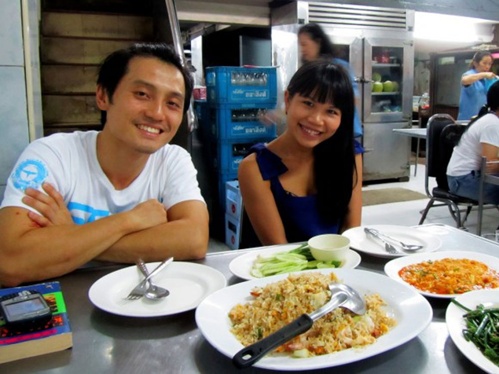 It turns out that Pat and Gak are correct that this place has the best orange juice in all of Thailand. The Pad Thai is also good, and comes wrapped in a little package of fried egg. Nice touch. It feels good to be together with all of these people. After all of these months in Asia, Pat and Gak have become our family, and it’s tough to leave them behind. Pat keeps us laughing with his quirky explanations of Thai social antics. He explains that in Thailand it’s not considered rude to tell someone that they look fat.