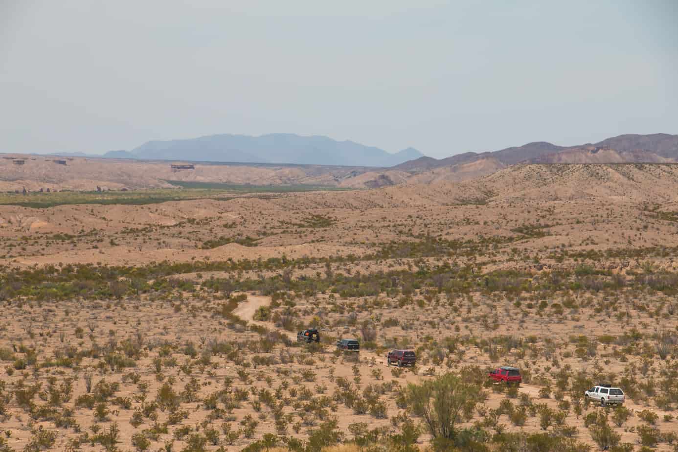 We awoke the following day to a rather unexpected change. The showers from the night before ended up being downpours in other parts of the park, which meant that our planned route down Maverick Road had been closed due to flooding. What was worse, the rangers were unsure of the condition of River Road, which led to our campsite for the night. The River Road is one of the most traveled dirt routes in Big Bend, and as you probably guessed, follows the banks of the Rio Grande. It’s a scenic trail, skirting along plateaus and climbing hills, but it also spends a good deal of time following dry river beds, which after storms, aren’t so dry. We decided to drive the road anyway and find out the conditions for ourselves. The group made a quick stop to drop air pressure for the soft sand and set out.