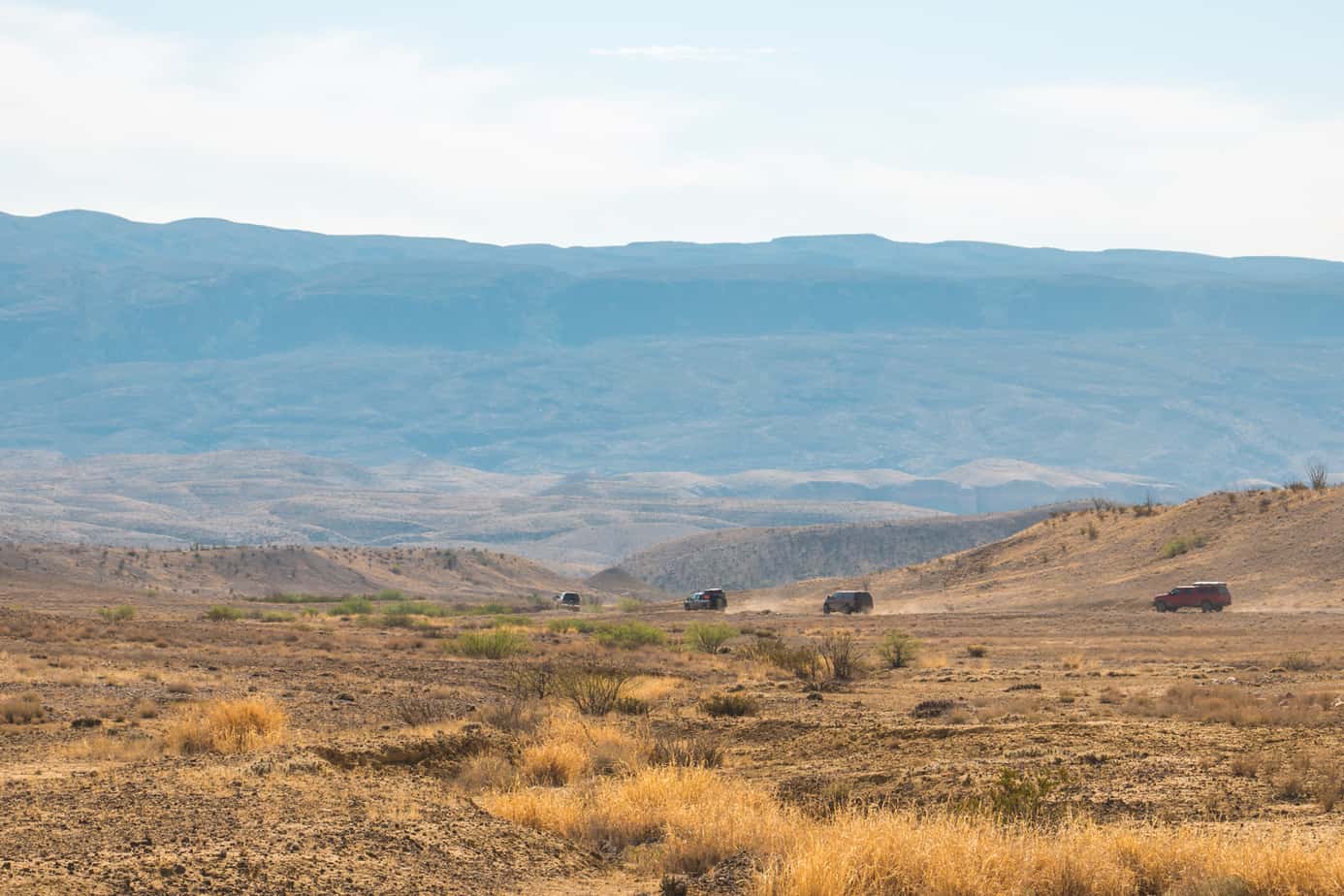 The remainder of that days’ drive felt like something out of a Western movie: the parched desert landscape was broken by a narrow serpent of green water, dust blowing in the wind, and the occasional buzzard soaring high overhead. The radios that had crackled with conversation throughout the trip went silent, and the trucks rolled through the scene like reverent patrons of Nature’s great show.