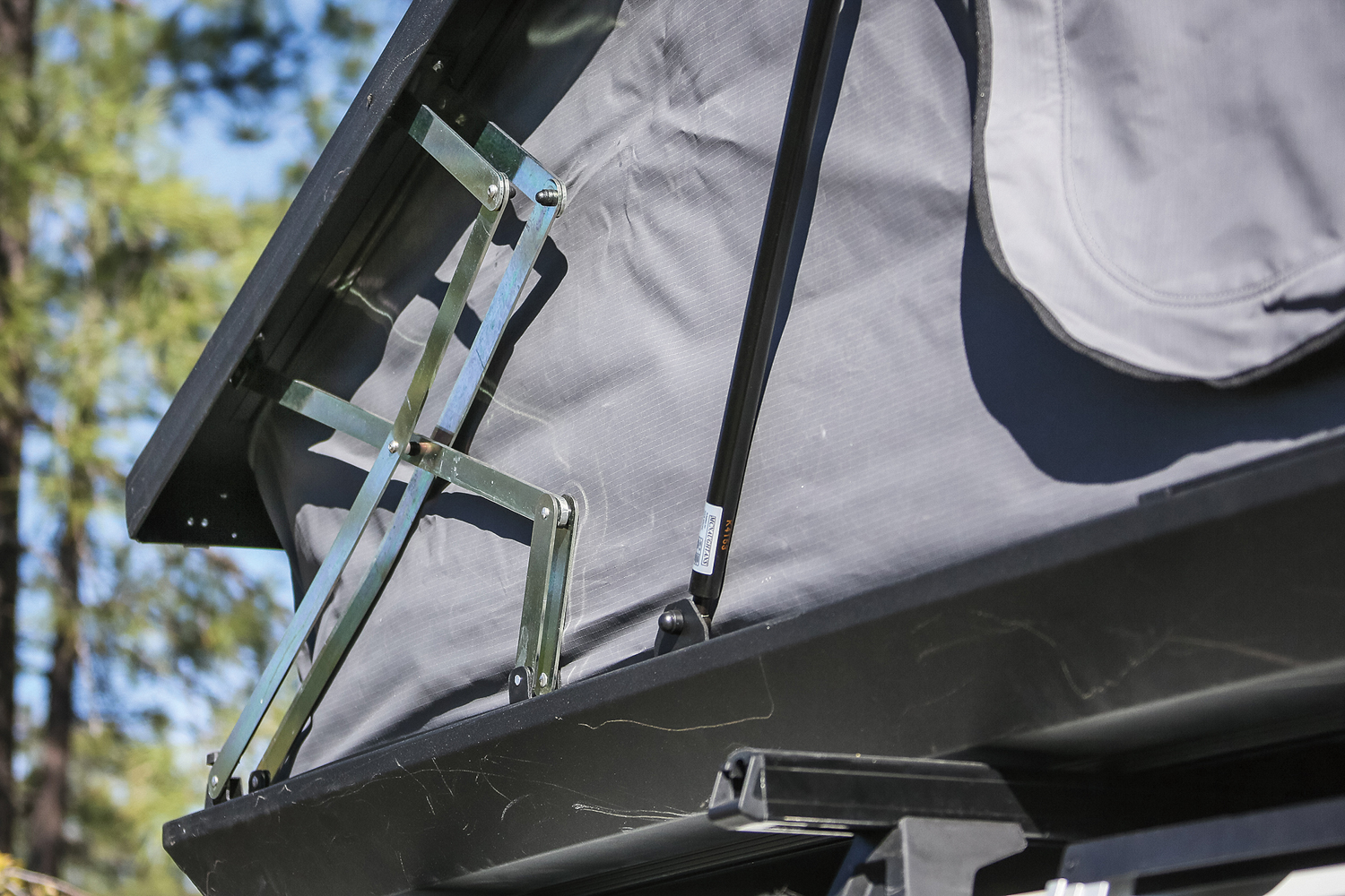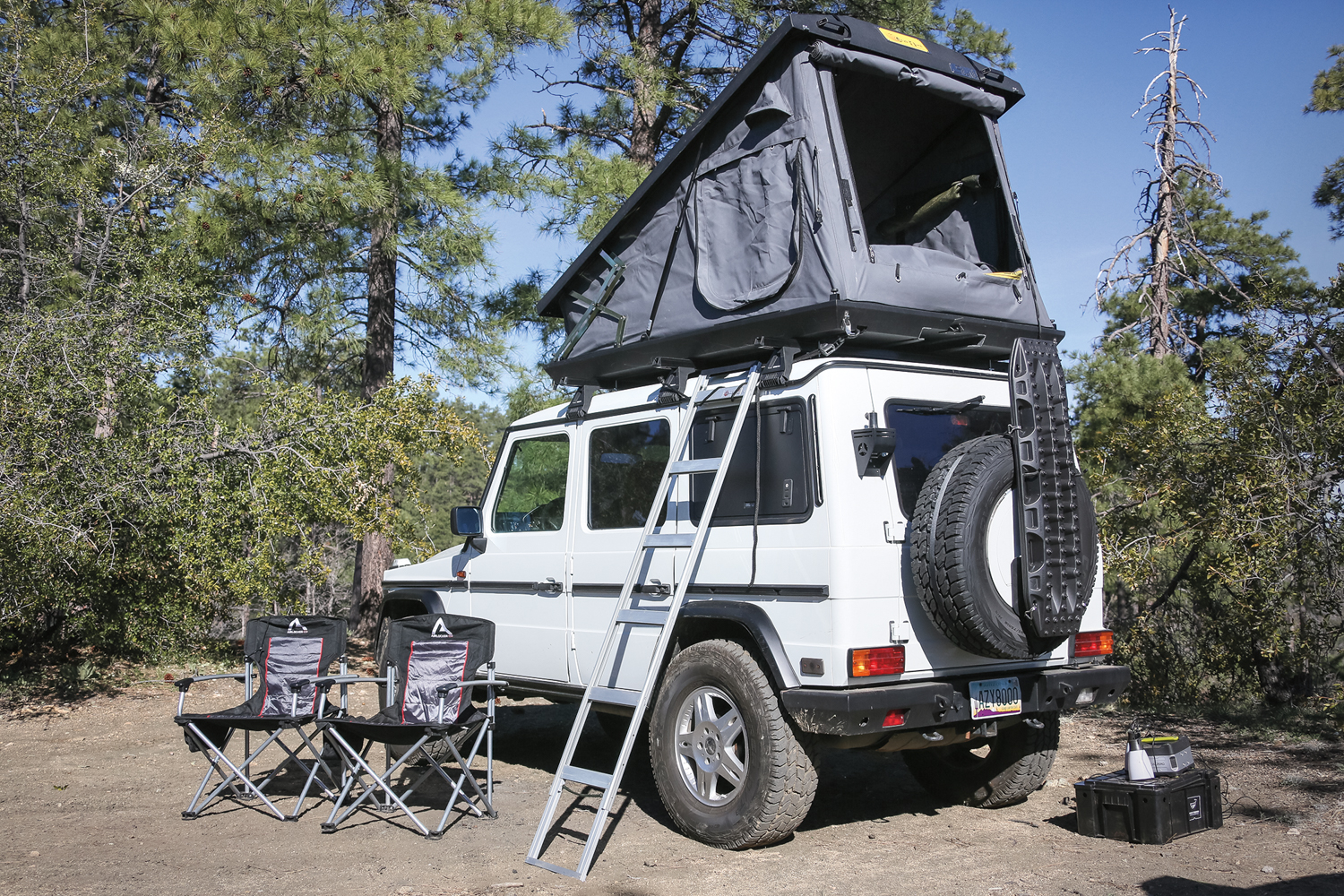 Everything about this tent exudes quality, from the welded and press-bent panels and recessed ladder storage to the ultra-plush mattress. Installation is simple and uses the same hardware as their other models. I fitted the Stealth to my Mercedes G-Class using three Rhino-Rack crossbars, distributing the 185-pound load over more of the rain gutter. Opening the shell requires unlatching four clasps and giving the rear handles a gentle press skyward. Once in motion, the large gas struts assist in lifting the top the rest of the way, resulting in an angled profile with about a foot of material in the front and a large rear canvas wall. The back allows for three entry points with screened and covered doors, all accessible by the movable ladder. Once inside, the fit and finish is excellent, with a padded ceiling and several ventilation ports. The main door can be propped open like an awning with two long (and retained) poles. My only complaint is a lack of inside pockets or nets to help better organize gear.