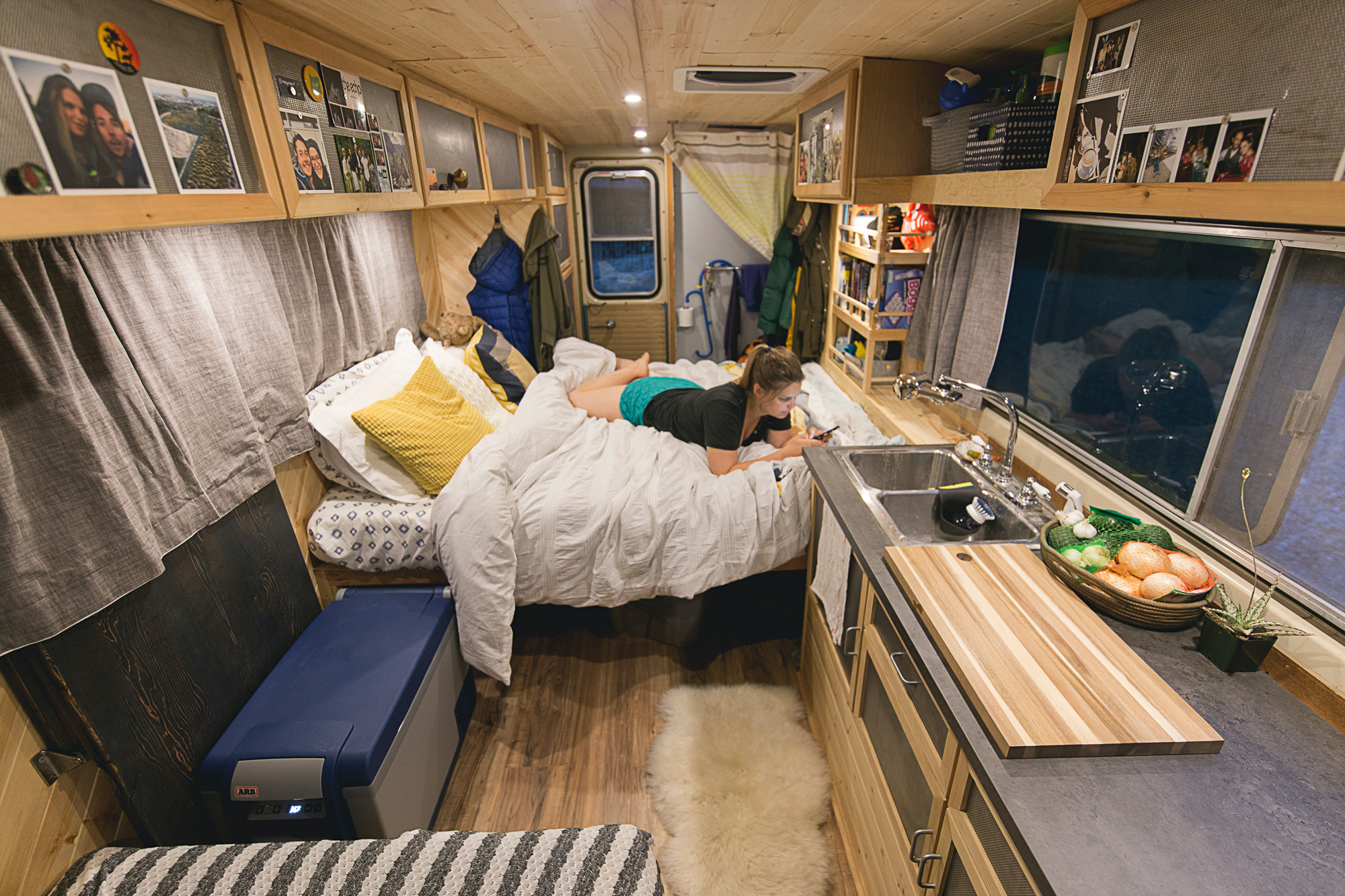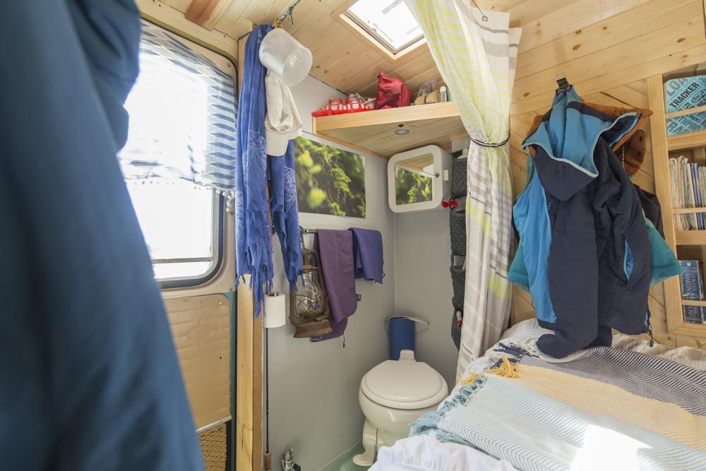 I opened up the interior by removing the rigid bathroom walls (replaced with a cloth curtain) and original closet/refrigerator housing. I installed tongue-and-groove pine on the walls and ceiling and installed a new composite floor. I rebuilt all the overhead storage out of pine and built custom cabinet faces with steel sheet-metal fronts. Recessed rare-earth magnets keep the cabinets closed. I rebuilt the kitchen cabinetry around a new 30-gallon water tank with a two-basin sink and DC water pump. All the plumbed water (for toilet and sink) drains to a single 30-gallon black-water tank.