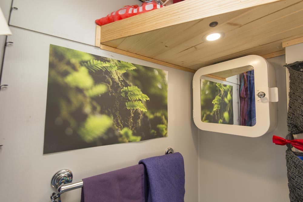 I opened up the interior by removing the rigid bathroom walls (replaced with a cloth curtain) and original closet/refrigerator housing. I installed tongue-and-groove pine on the walls and ceiling and installed a new composite floor. I rebuilt all the overhead storage out of pine and built custom cabinet faces with steel sheet-metal fronts. Recessed rare-earth magnets keep the cabinets closed. I rebuilt the kitchen cabinetry around a new 30-gallon water tank with a two-basin sink and DC water pump. All the plumbed water (for toilet and sink) drains to a single 30-gallon black-water tank.