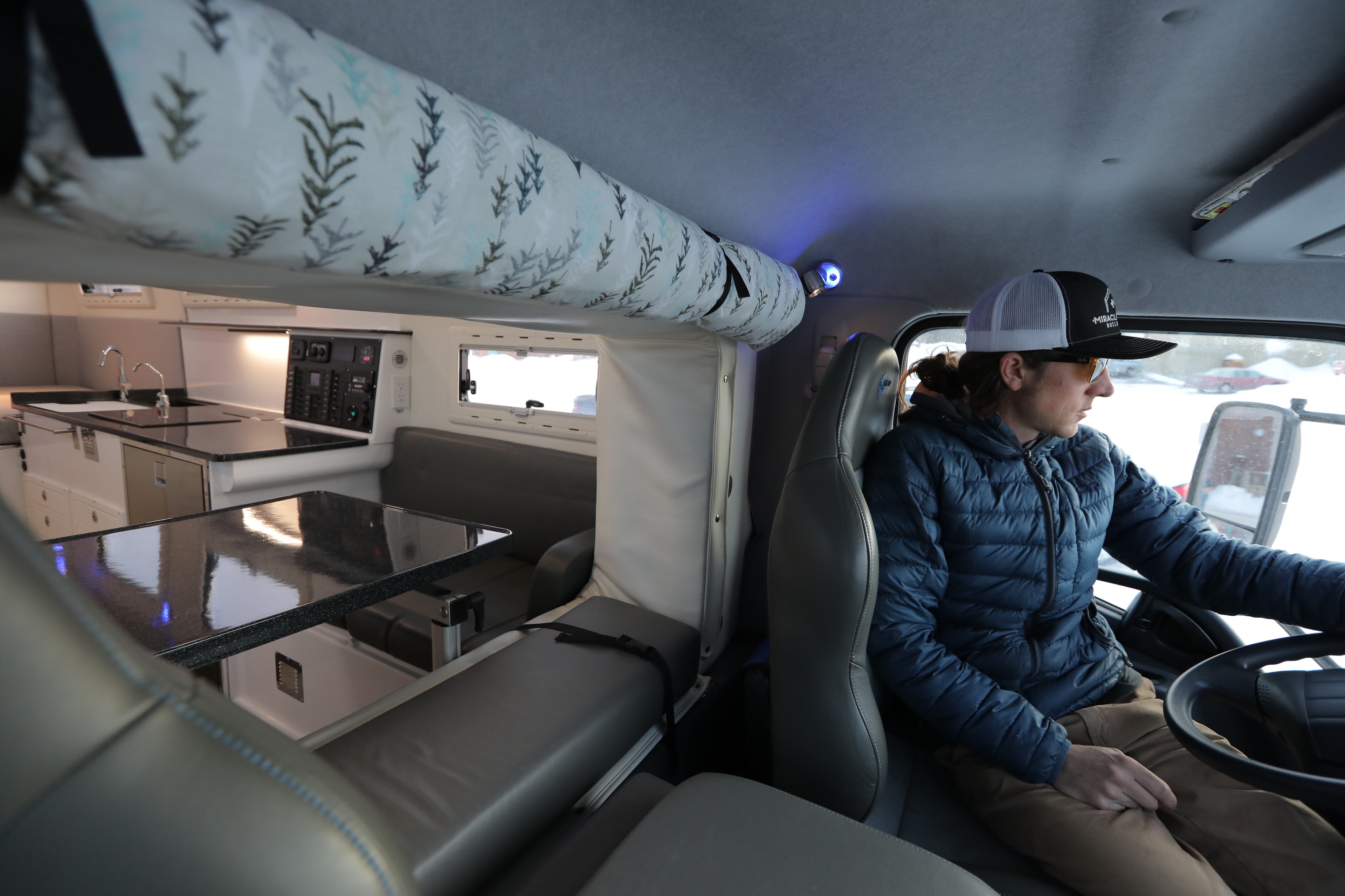- Double layer Warm Window Fabric Insulated cab privacy curtain with print on the interior – black wool on cab side.