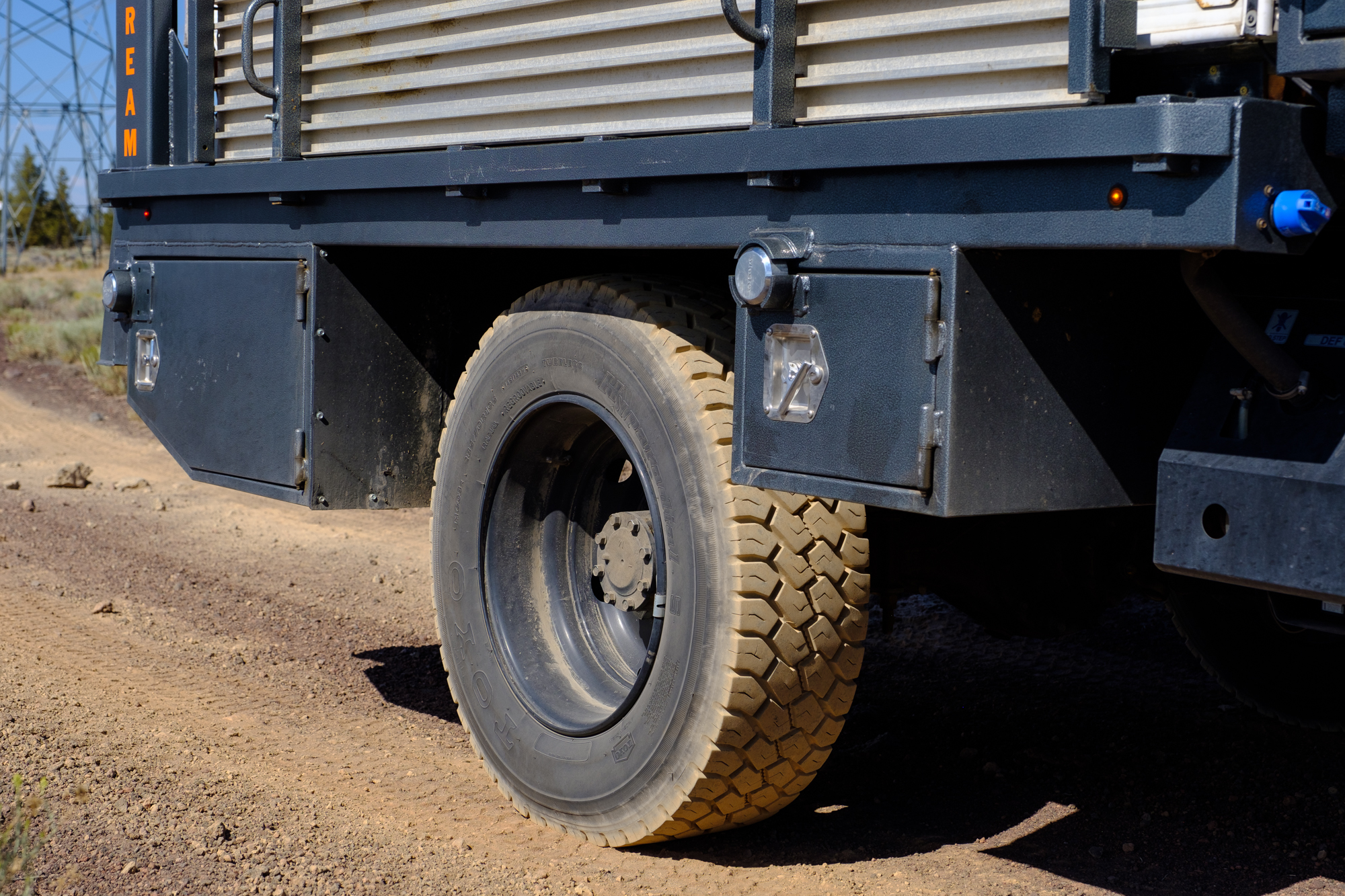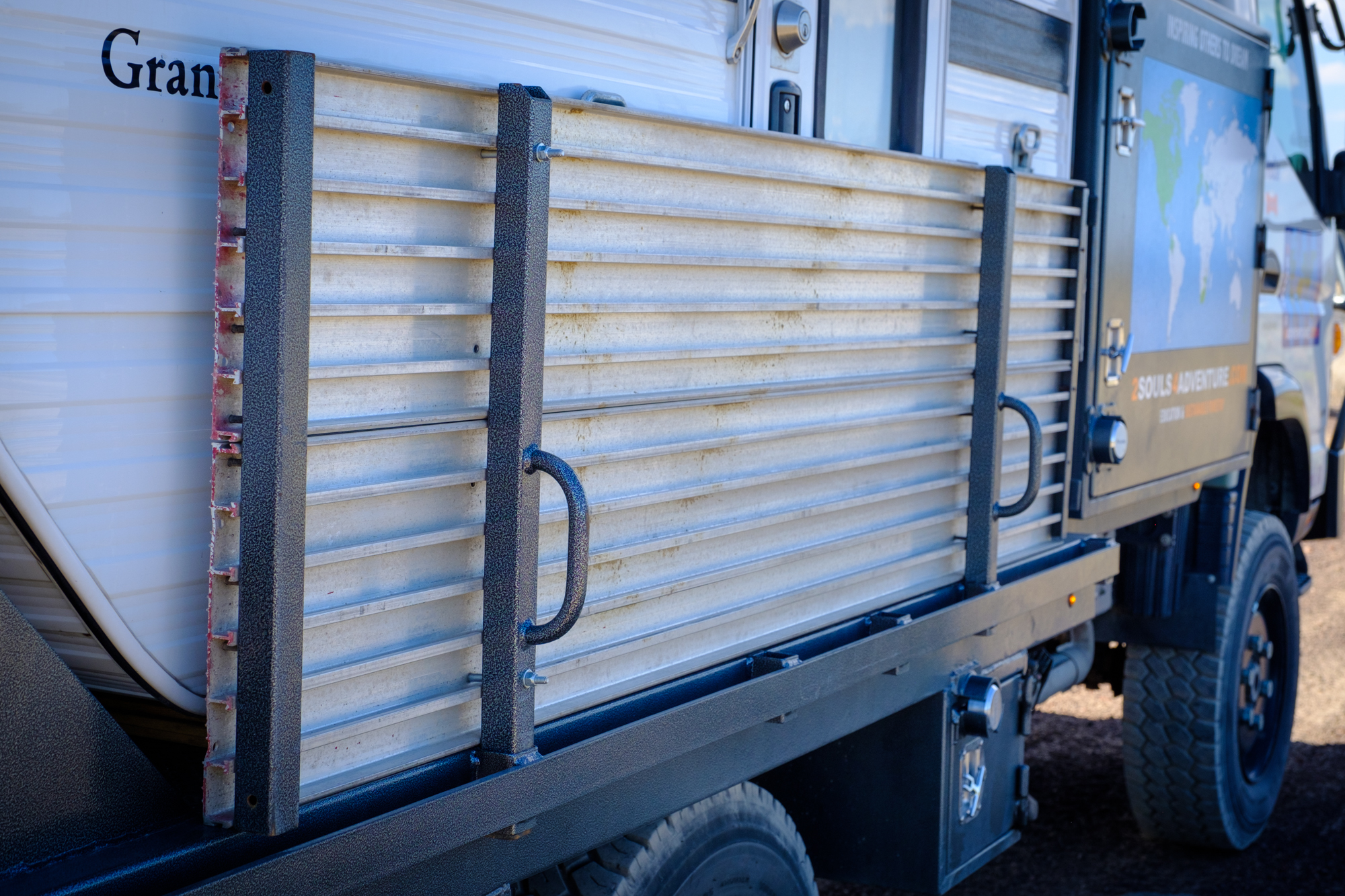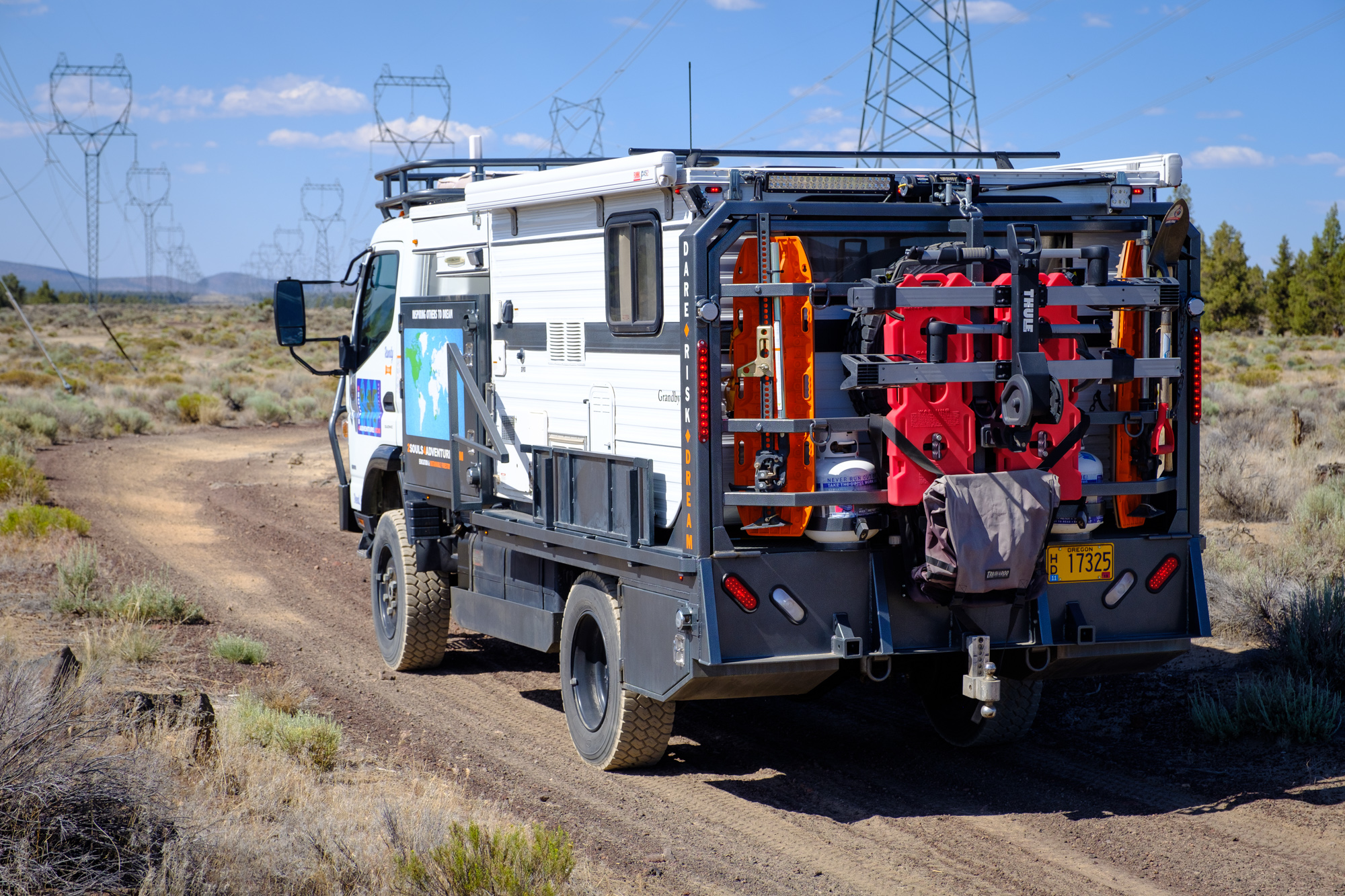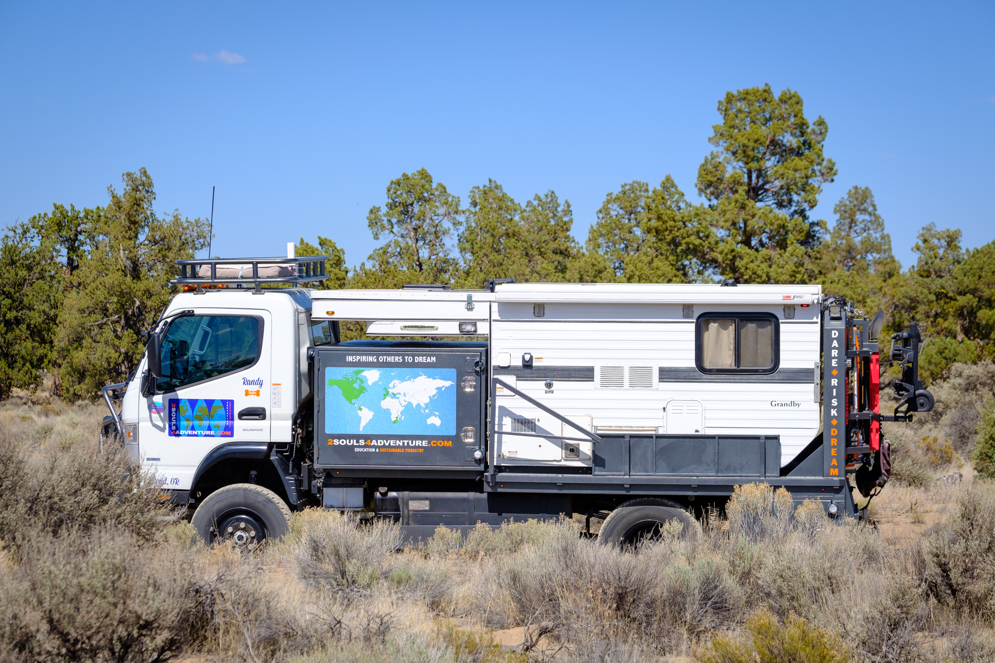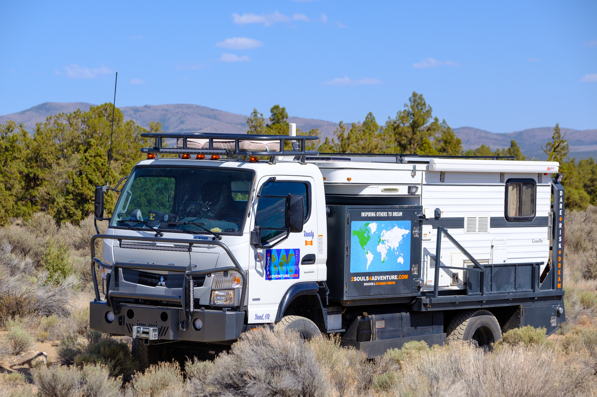 According to Randy, this vehicle is the product of over 500 hours of work, including 35 hours of CAD time and a sizable amount of cash. The 2017 Fuso FG 4×4 has been paired with a custom flatbed to accommodate the 2016 Grandby Four Wheel Camper, along with side guards to shield the shell from impacts of brush, dirt, or trees. Lockable storage boxes are mounted in nearly every spare nook and cranny, which provides room for a serious amount of gear on any adventure.
