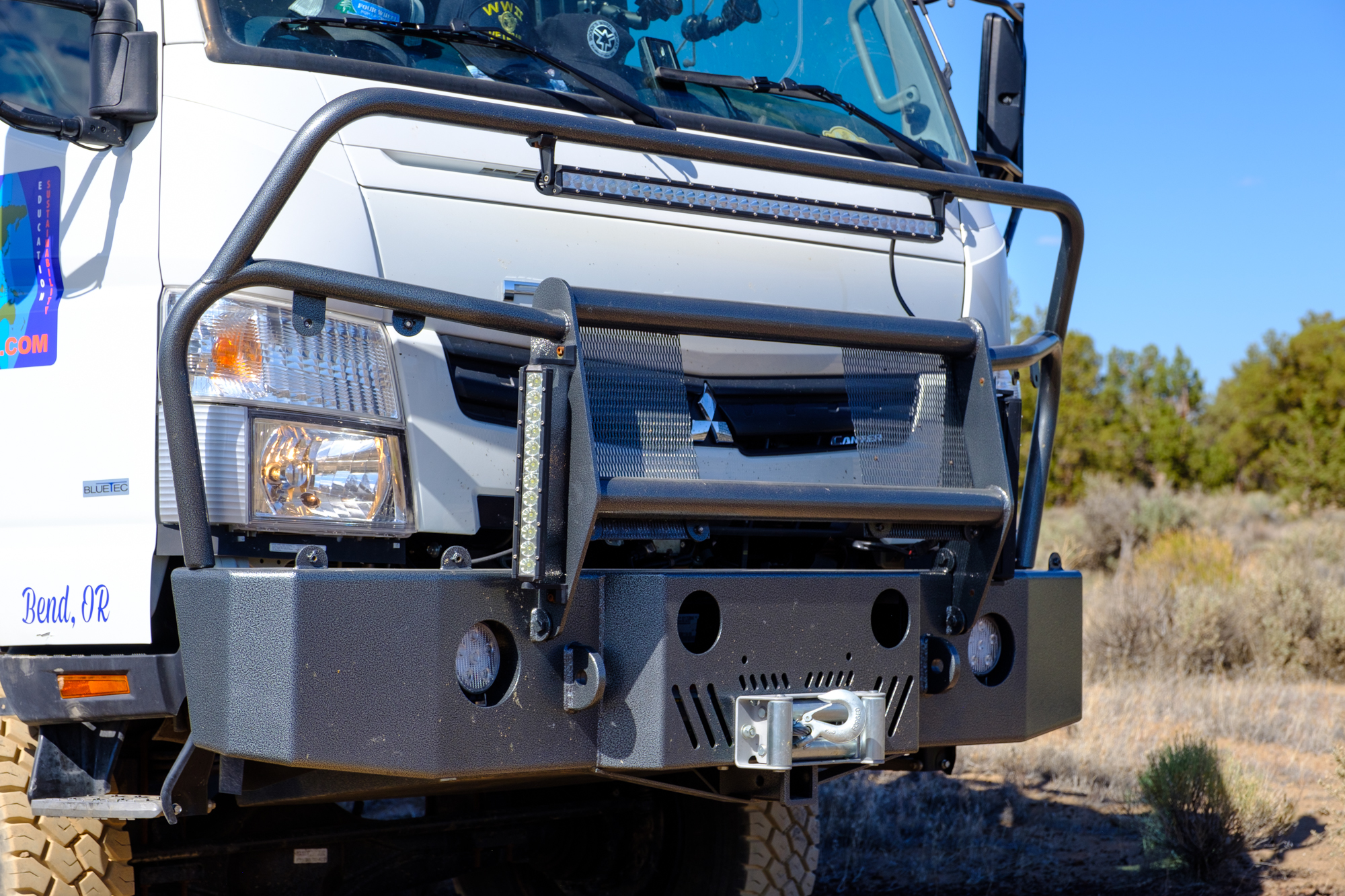 Skid plates were then installed along the undercarriage to protect against any debris or large obstacles the Fuso may encounter, but the more likely threat was from animal strikes and impacts from other vehicles. For this, Randy opted for steel front and rear bumpers, each housing a 16,000-pound winch and auxiliary lighting. The rear bumper doubles as a gear cage for equipment like Maxtrax, Hi-Lift jacks, fuel, and propane, and can be lowered using a third small integrated winch.