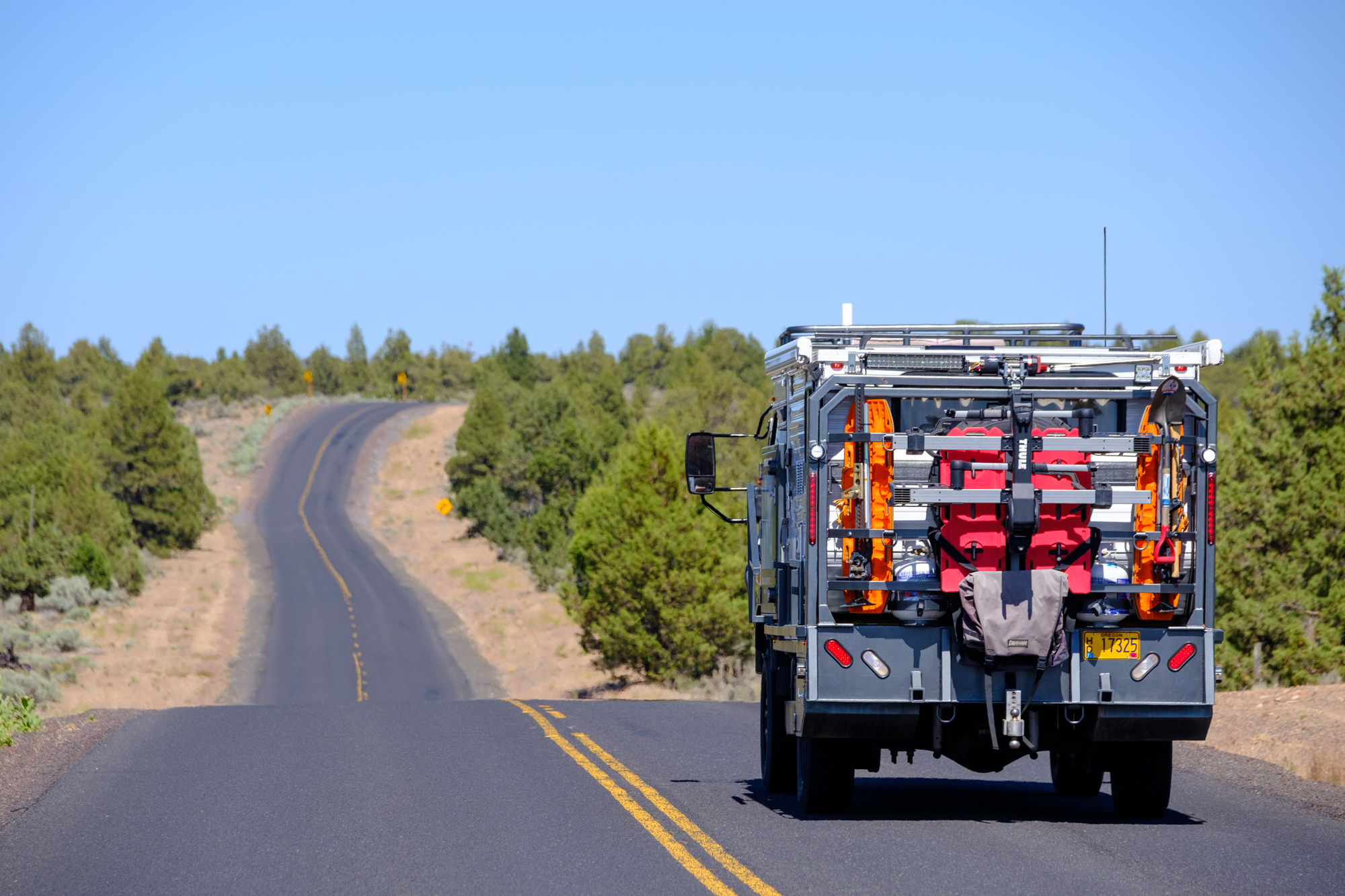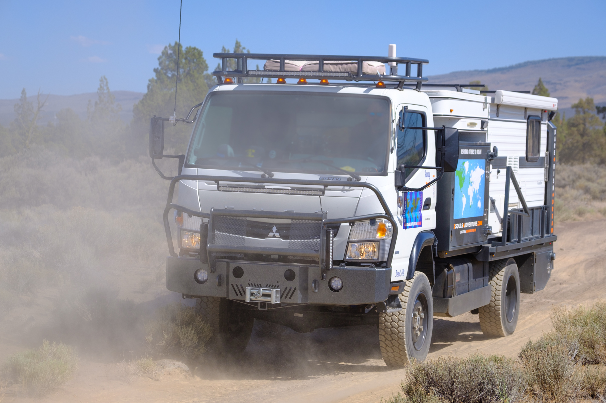 According to Randy, this vehicle is the product of over 500 hours of work, including 35 hours of CAD time and a sizable amount of cash. The 2017 Fuso FG 4×4 has been paired with a custom flatbed to accommodate the 2016 Grandby Four Wheel Camper, along with side guards to shield the shell from impacts of brush, dirt, or trees. Lockable storage boxes are mounted in nearly every spare nook and cranny, which provides room for a serious amount of gear on any adventure.