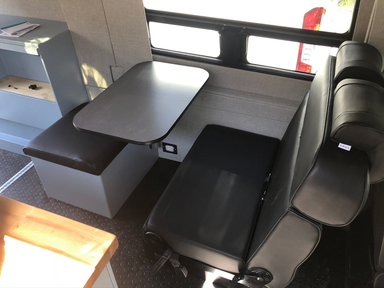 One of the most talked-about features of this van is the 2nd-row seat. The seat has the ability to convert to a bed (34″ wide), or a rear-facing dinette seat which allows for amazing versatility. In fact, in use for two travelers, we found ourselves leaving the dinette set up full time and only convert it to forward-facing when required to give a ride. The dinette is finished off with a Lagun table mount and a stowable laminated tabletop. Inside the upholstered bench seat is a cassette style porta potty.
