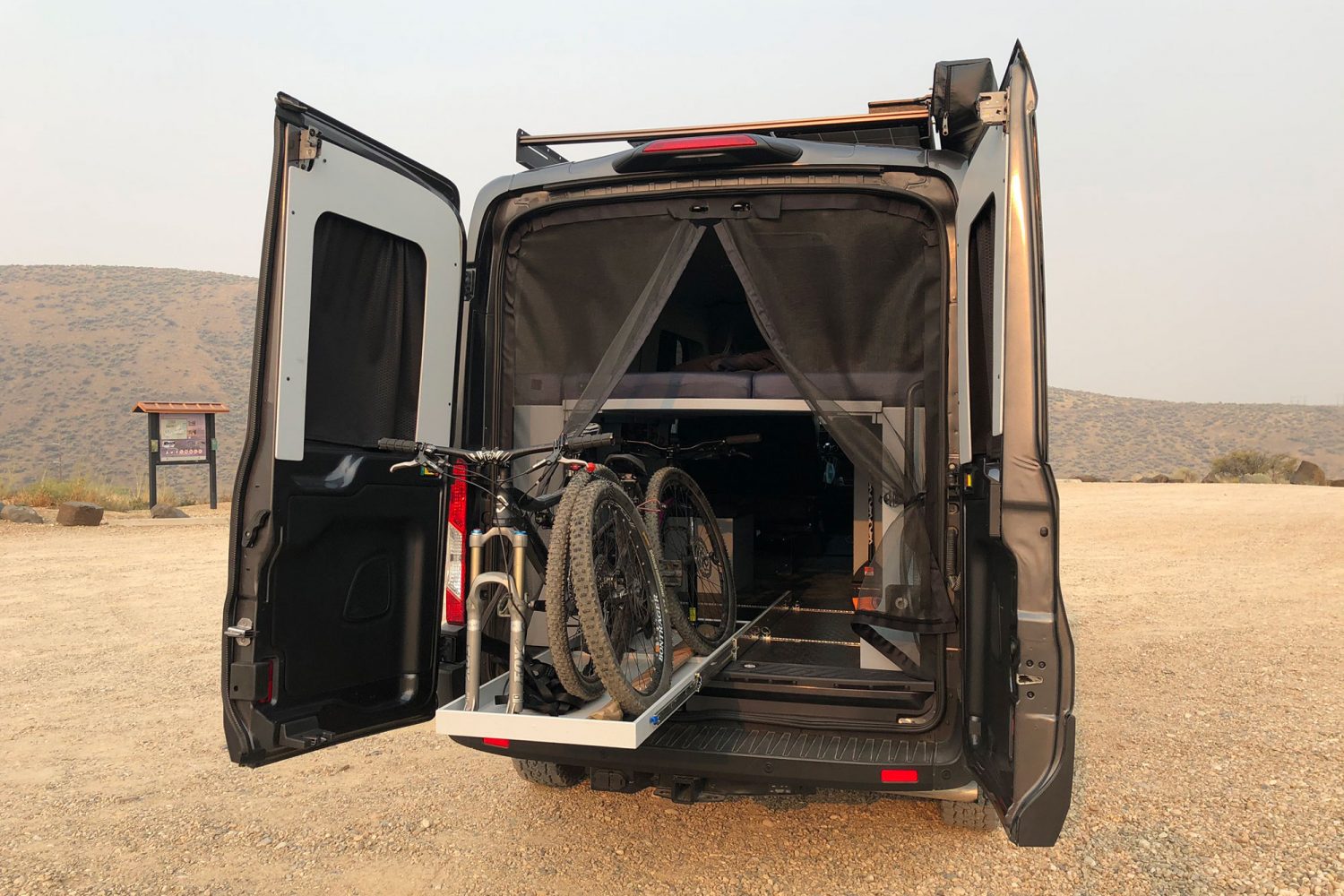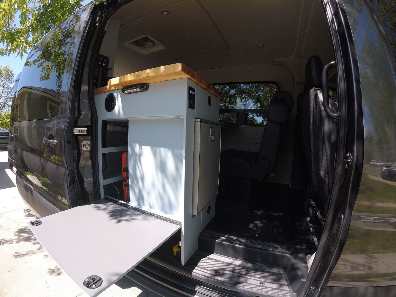 Turning our attention to the inside we used the “everything you need and nothing you don’t need approach”. The highlight is the Indoor/outdoor kitchen. When we camp, we tend to want to be outdoors so the kitchen functions so that everything in the kitchen can be retrieved from inside or outside the van. This includes two drawers, the Isotherm Cruise49 fridge, and a cabinet area accessible in or out that stores the GSI Selkirk propane stove. We chose not to permanently install a stove because again, we like options, inside/ outside/ in another vehicle, replacement, etc. Shade over the kitchen and the rear cargo doors can be obtained with the deployment of the Overland Vehicle Systems Nomadic 270 awning.