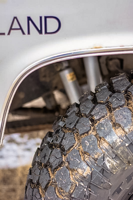Upgrades on the exterior include two 100-watt solar panels and a 40-amp charge controller to regulate the power. This feeds two 100-amp-hour AGM auxiliary batteries, leaving the main battery for cranking up the truck’s enormous motor. A roof rack has been added, with an 8-gallon solar shower and a full-size spare. The front end was rebuilt with brand-new upper and lower ball joints, inner and outer tie rods, a new drag link, and new steering stabilizer. KYB shocks replaced the tired stock units, and 10 ply 315/75R16 tires were stuffed underneath for additional traction and an aggressive look. Helping to turn these beasts are a brand-new power steering pump, lines, and power steering box. A dual-exhaust system and mufflers were added at the same time, and the rather underwhelming stock headlights were replaced with LEDs.