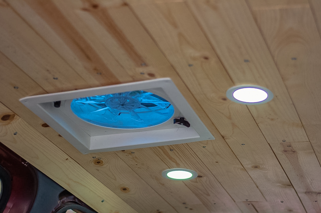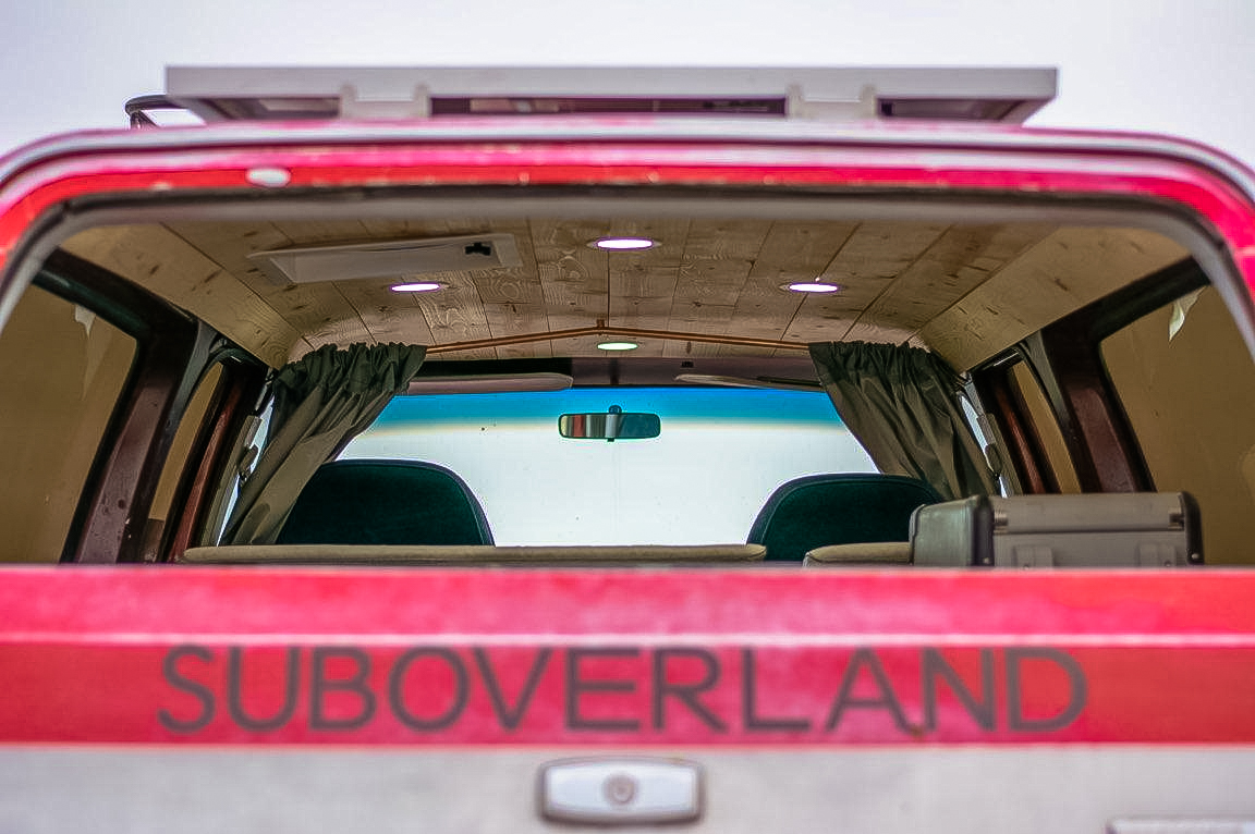 Things really get interesting on the inside of this 80’s Burb though. For starters, the steel shell has been fully insulated, and a gorgeous pine ceiling was installed to give it a distinct surf or mountain vibe. This is lined with flush LED recessed lighting and a fantastic fan for controlling temperatures at night and reducing condensation. Insulated window inserts were created along with the interior curtains, making stealth camping a breeze regardless of where you find yourself.