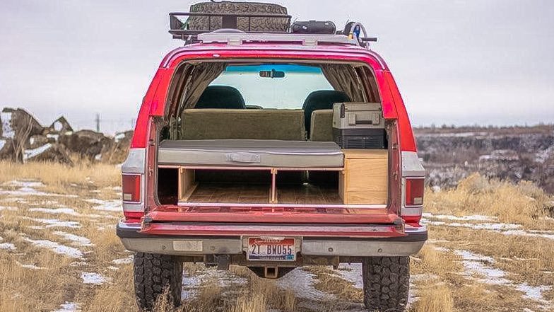 Not that you’ll be slumming it on a back seat or anything while stealth camping, as this truck features a platform bed with a full-size mattress inside. Beneath it, there’s plenty of room for bags and gear, or maybe a kitchen kit to go along with the Dometic CFX28 refrigerator/freezer bolted nearby. There are 12-volt plugs serve your charging needs in the rear, along with a 1,000-watt inverter for computers and other larger electronics.