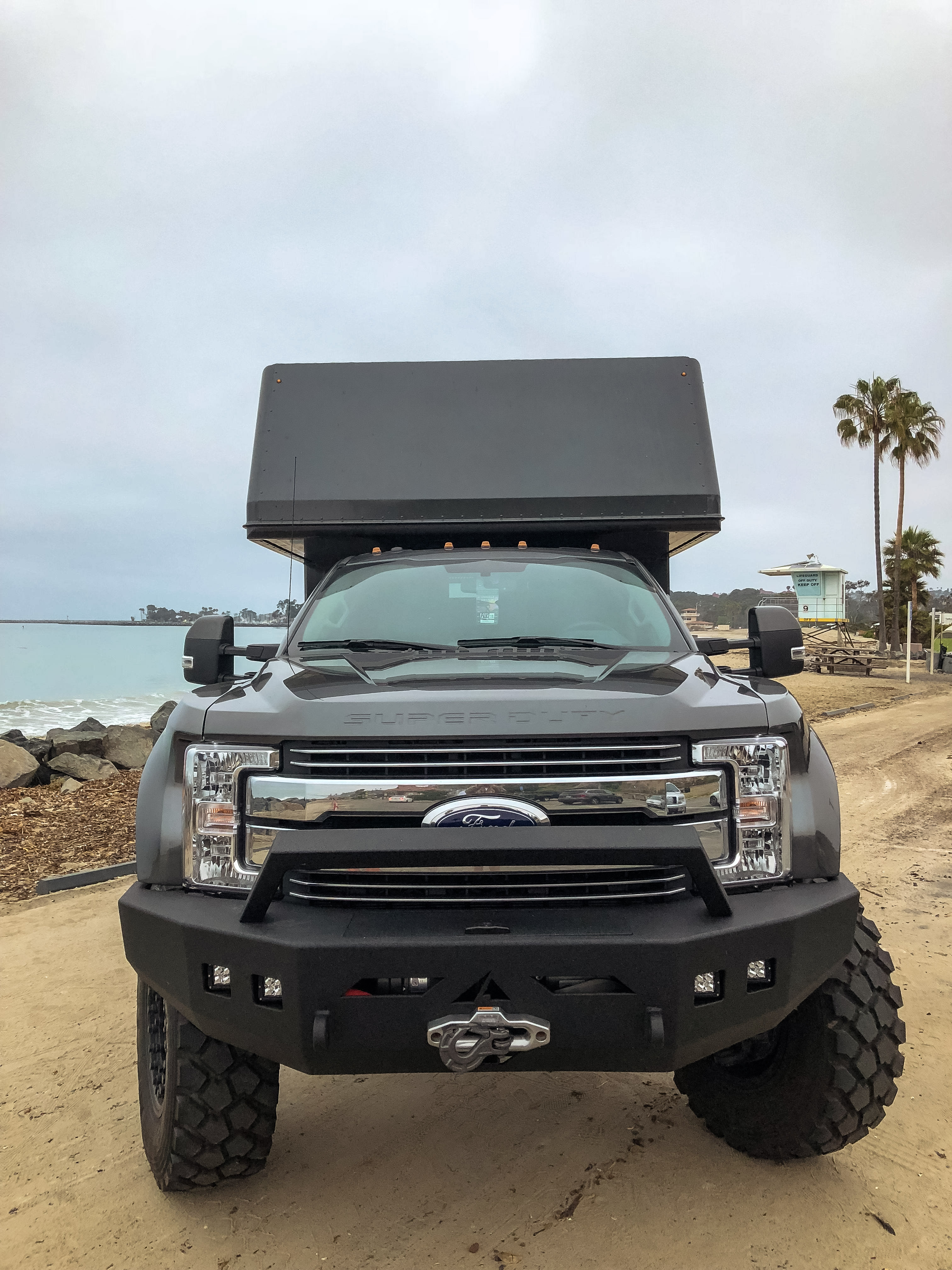 The base is a 2017 Ford F550 Lariat. It, of course, came with four-wheel drive, seating for five, and shockingly, is still under full factory warranty as the team worked to keep everything within spec to retain it. Think of this vehicle as an EarthRoamer meets toy hauler, but without the hassle of towing a trailer. It weighs in at 14,000 pounds, is 12 inches wider than stock, and measures 29 feet long, which is quite good for a full-size RV.