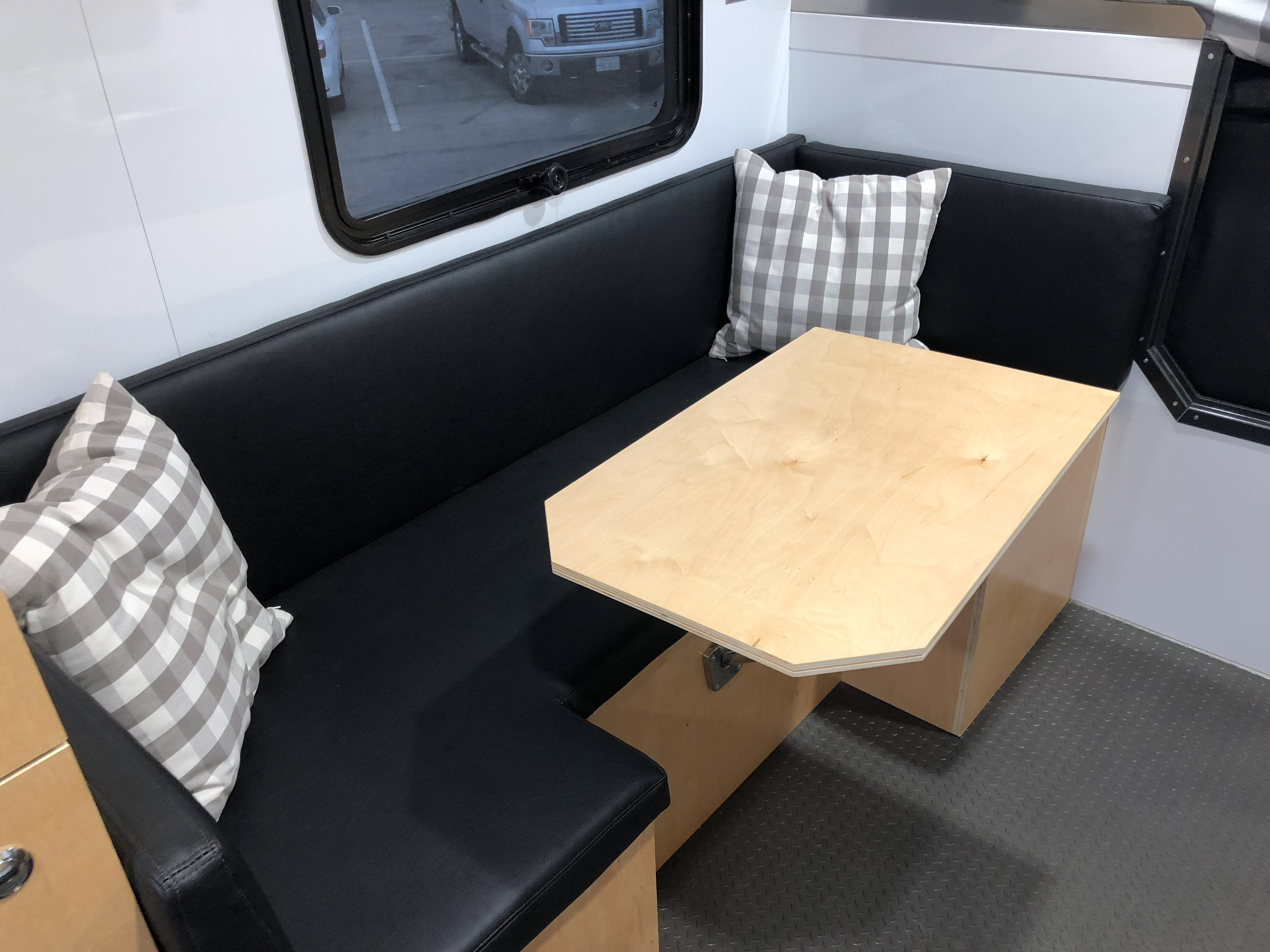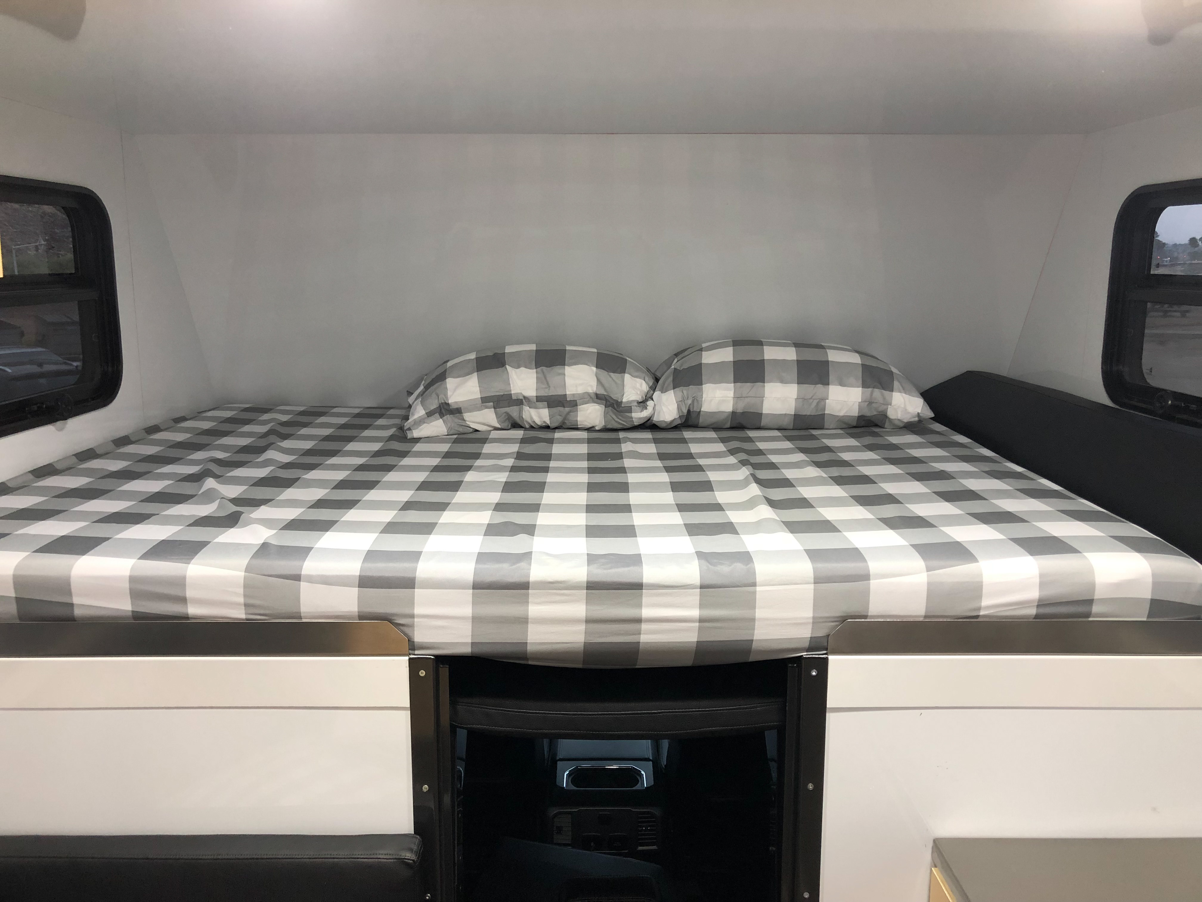 The owner states that the camper is a combination of aluminum framing and a composite body insulated with 2.5 inches of foam. Sound deadening was added throughout to keep things quiet, as well as to help with temperatures in cold or hot environments. A pass-through has been cut to the cab, but can be sealed off with purpose-built cushions intended to create a temperature and sound seal from the camper to the truck. This makes a huge difference in cold climates where all of the glass of the vehicle lets in the frigid air. This pass-through also serves the primary purpose of allowing passengers to move from the truck to camper and back again without leaving the vehicle.