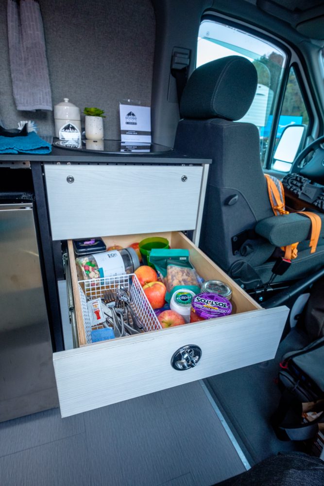 If you’re not in love with the furniture layout, the Goose Gear S-series furniture is reconfigurable by virtue of the airline track (L-track) mounting system embedded into the floor, ceiling, and walls. All it takes is unfastening four to six bolts per furniture piece to relocate. This also allows for dual-use as an overlanding or utility vehicle to haul 4×8 sheets of plywood.