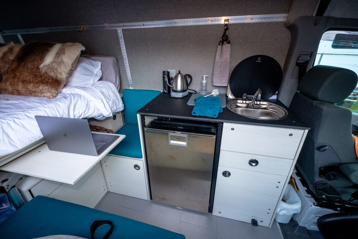 Transiting across the country is easy in this vehicle. Stealth camping in Walmart parking lots or industrial parks is a breeze due to the lack of ‘overlanding jewelry’ on the exterior. The typical stuff people usually carry on the exterior (Hi-Lift jack, jerry cans, sports equipment, etc.) easily fit in the Sprinter’s massive garage beneath the bed. The patent-pending, two-axis, electrically leveling bed allows for a good night’s sleep when the only parking (or camping) spot is quite unlevel. The modified full-size foam mattress is 4 inches thick.